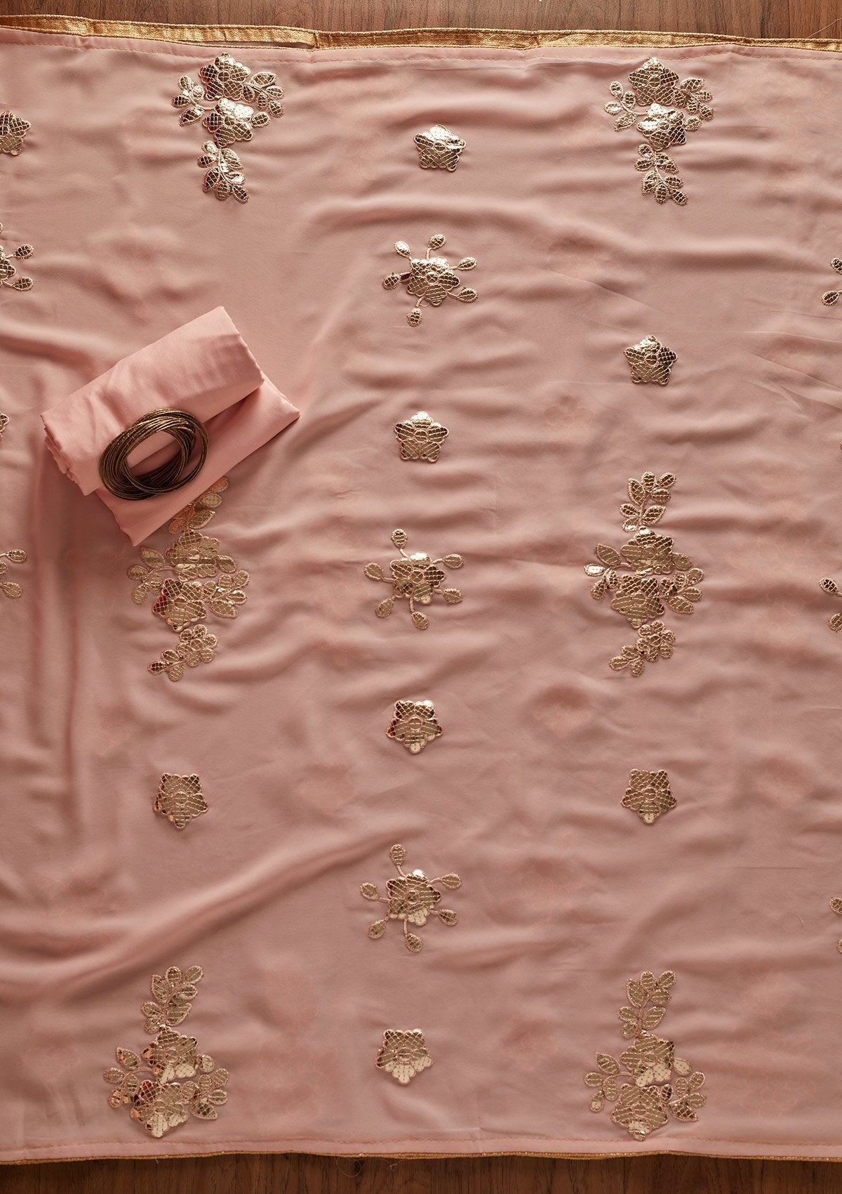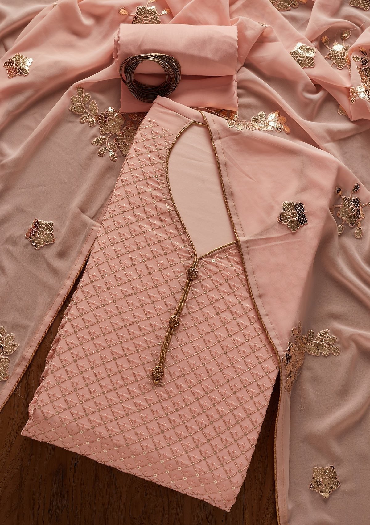 Peach Salwar Suit In Georgette Fabric. The Salwar Suit Is Embellished With Sequins Embroidery. Accompanied with an unstitched bottom and dupatta. Comes With The Koskii Promise Of Premium Quality.