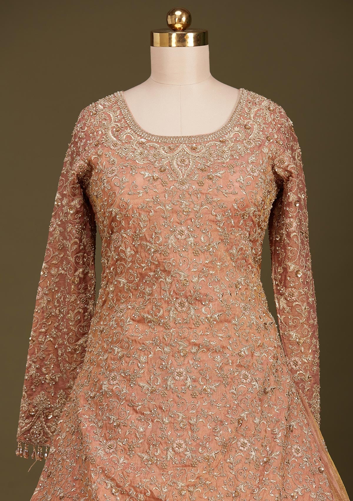 Peach Readymade Lehenga in Tissue fabric. The Lehenga is embellished with Stonework (Gold) embroidery. Accompanied with an Readymade blouse and dupatta. Comes with the Koskii promise of premium quality.