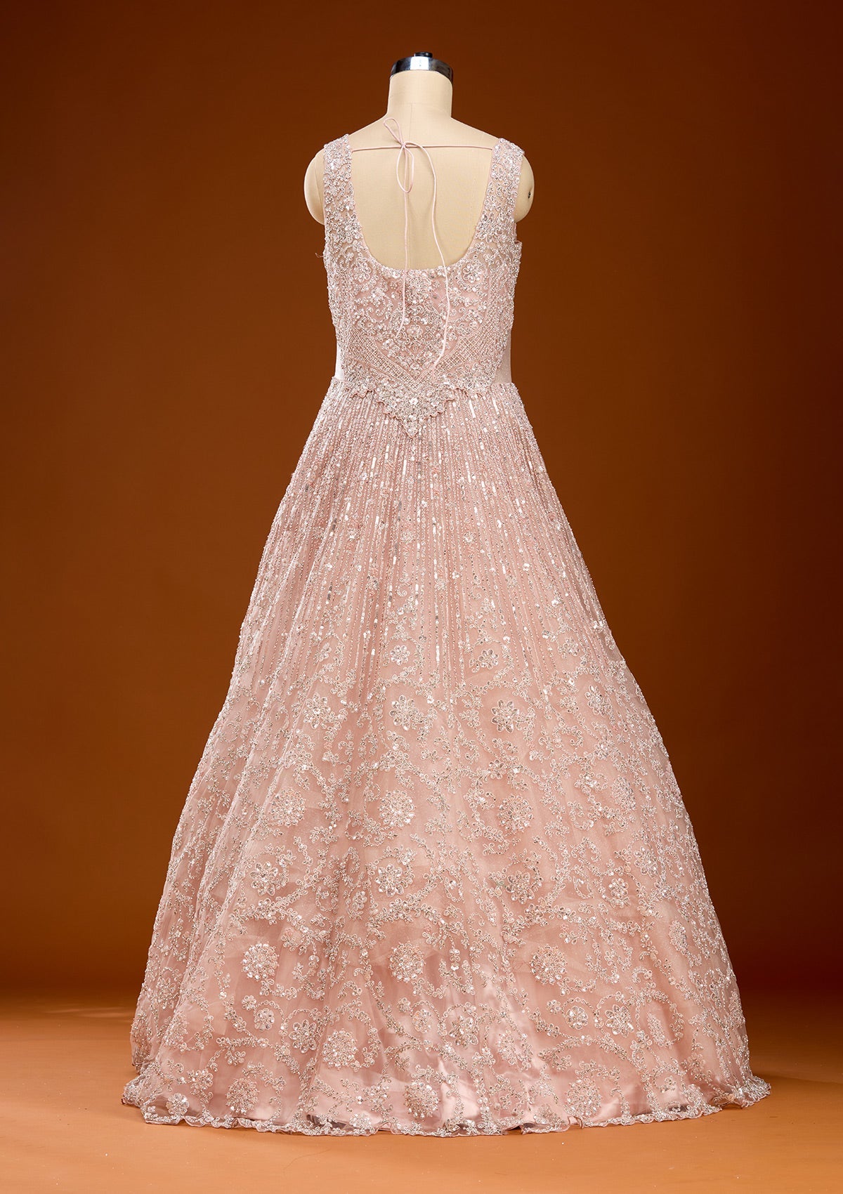Peach Readymade Gown in Net fabric. The Gown is embellished with Stonework embroidery. The Peach Gown has a V Neck. Comes with the Koskii promise of premium quality.