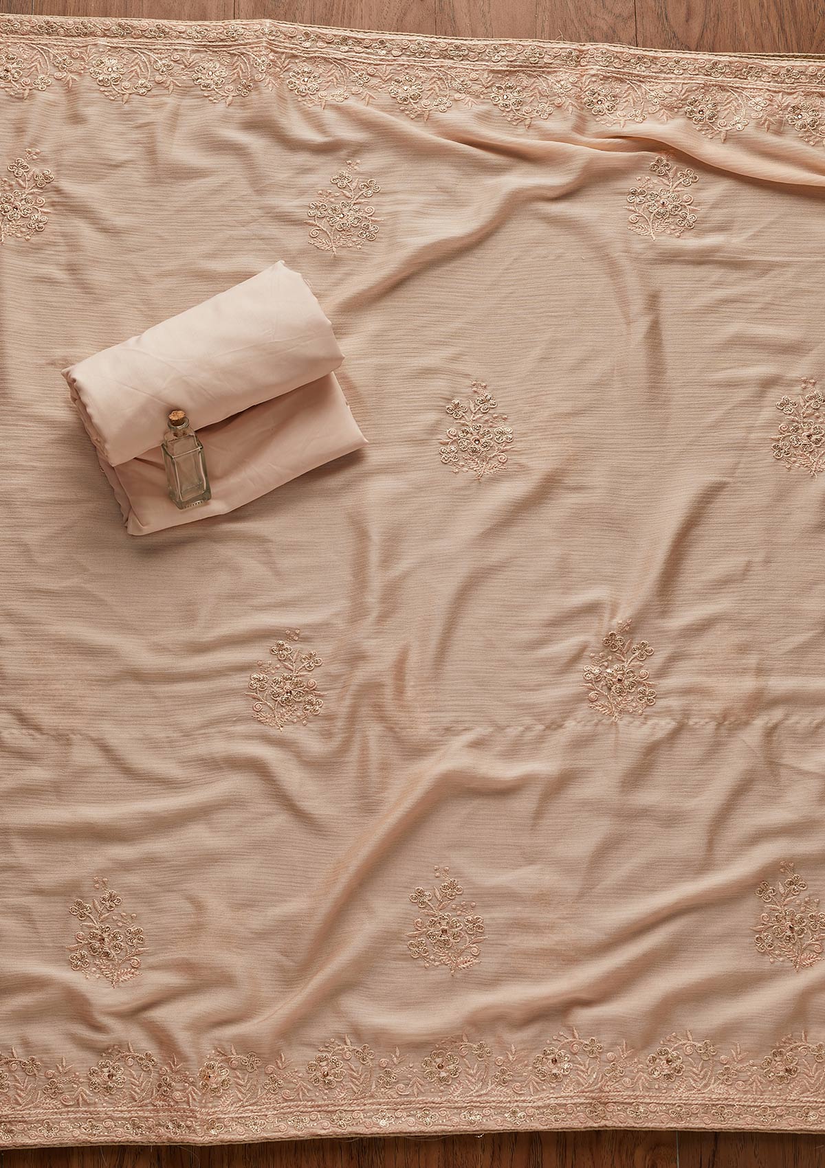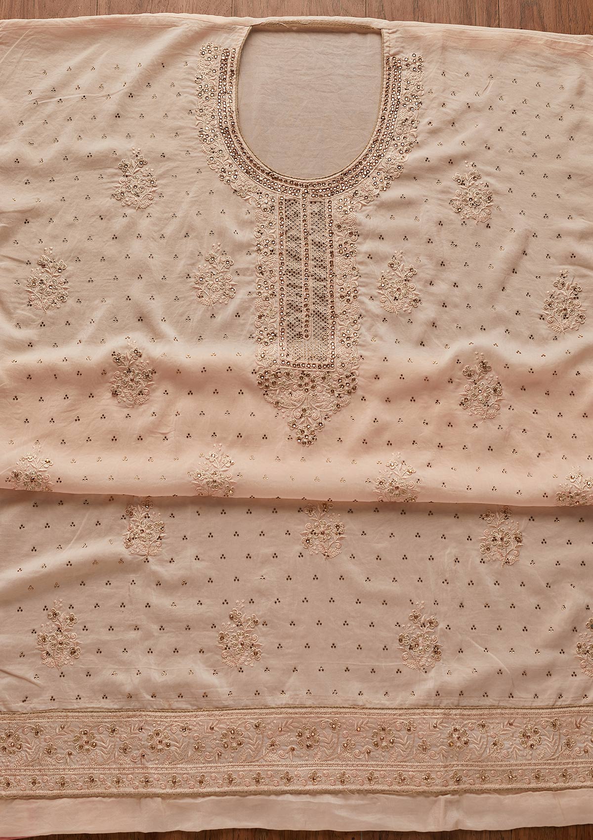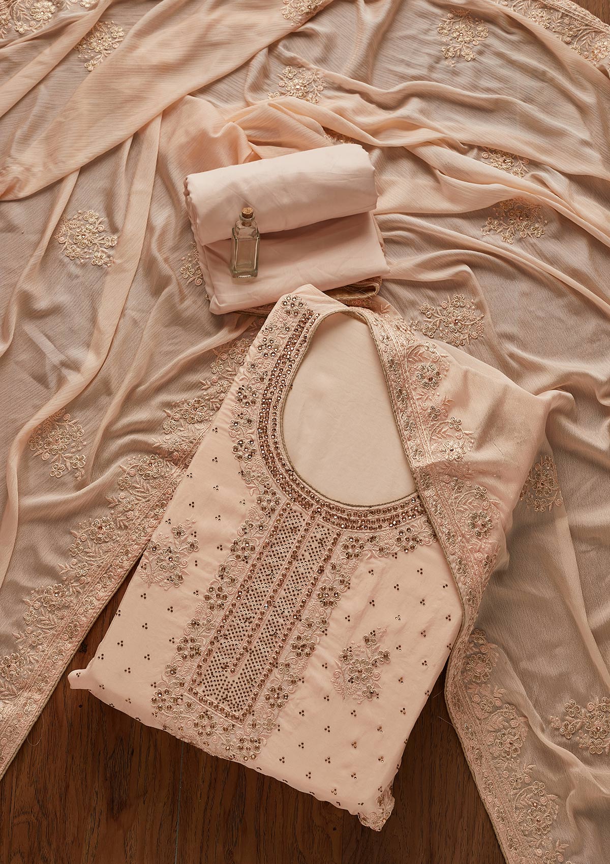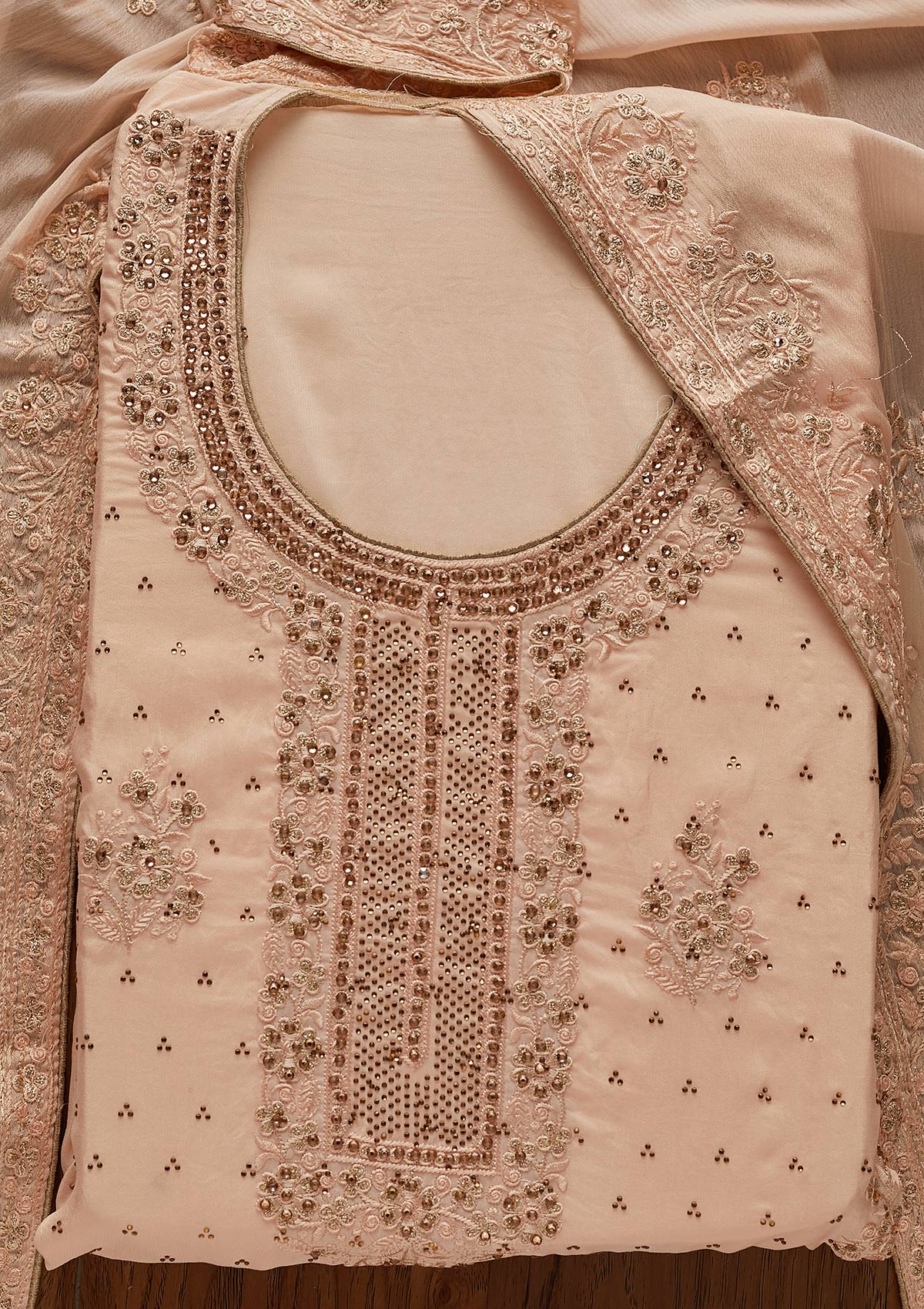 Peach Salwar Suit In Semi Crepe Fabric. The Salwar Suit Is Embellished With Swarovski stone work. Accompanied with an unstitched bottom and dupatta. Comes With The Koskii Promise Of Premium Quality.