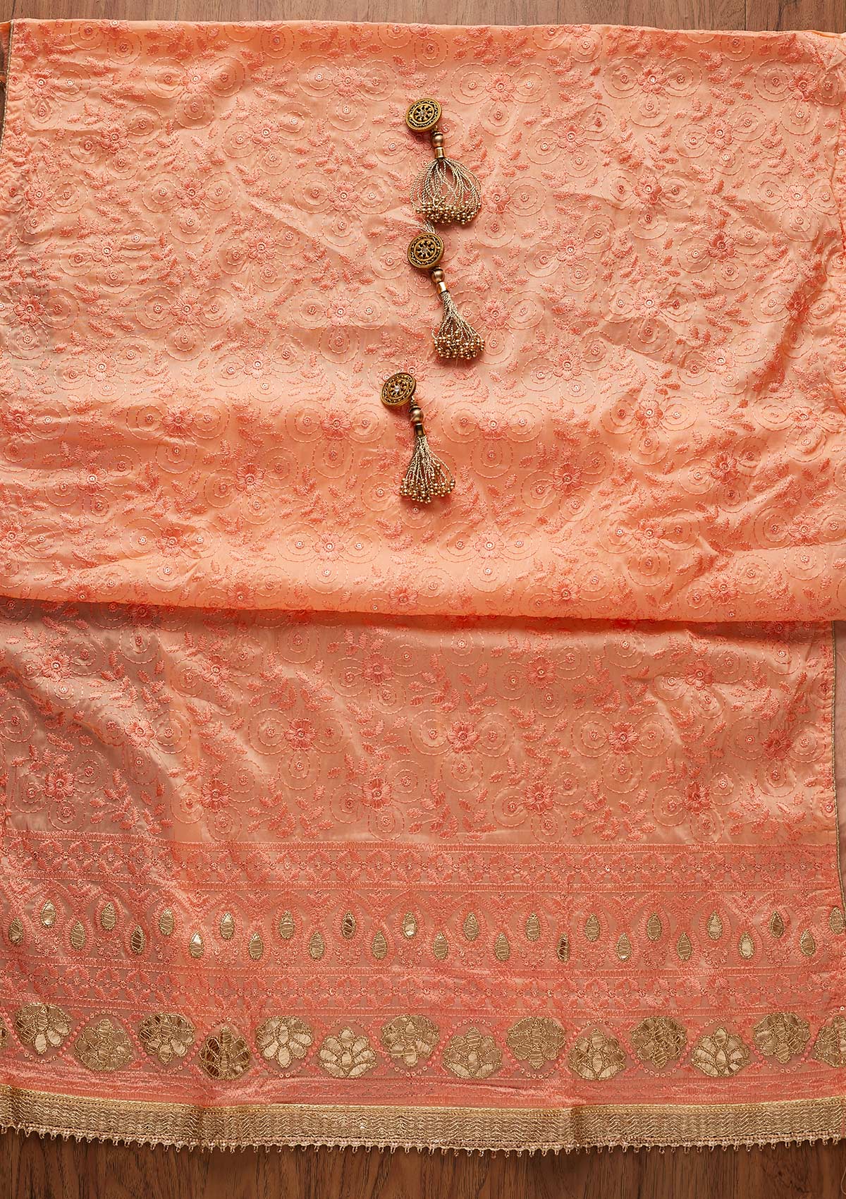 Peach Salwar Suit In Chanderi Fabric. The Salwar Suit Is Embellished With Threadwork Embroidery. Accompanied with an unstitched bottom and dupatta. Comes With The Koskii Promise Of Premium Quality.