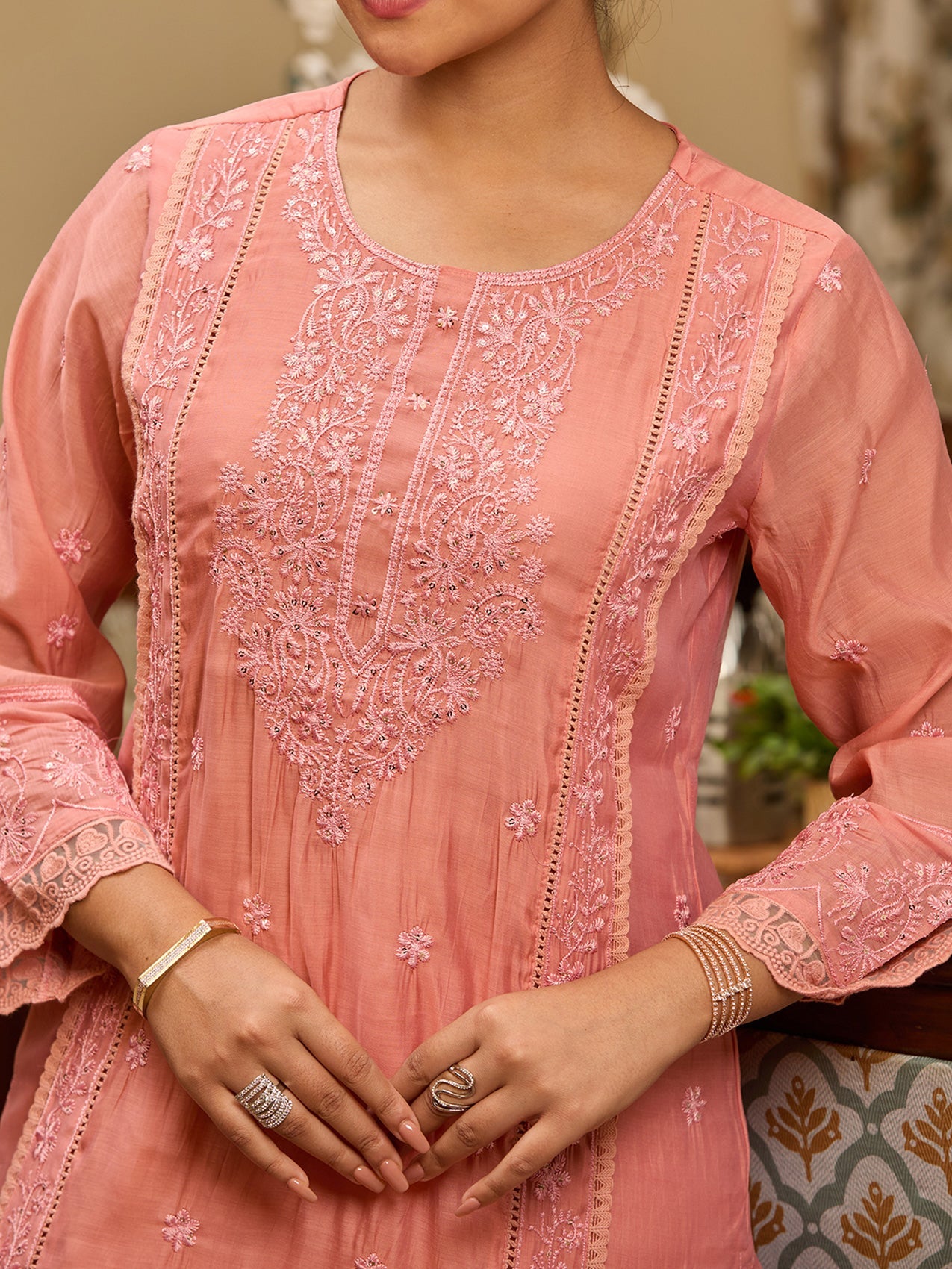 Peach Salwar Suit in Chanderi fabric. The Salwar Suit is embellished with Threadwork embroidery. Accompanied with a bottom and dupatta. Comes with the Koskii promise of premium quality.