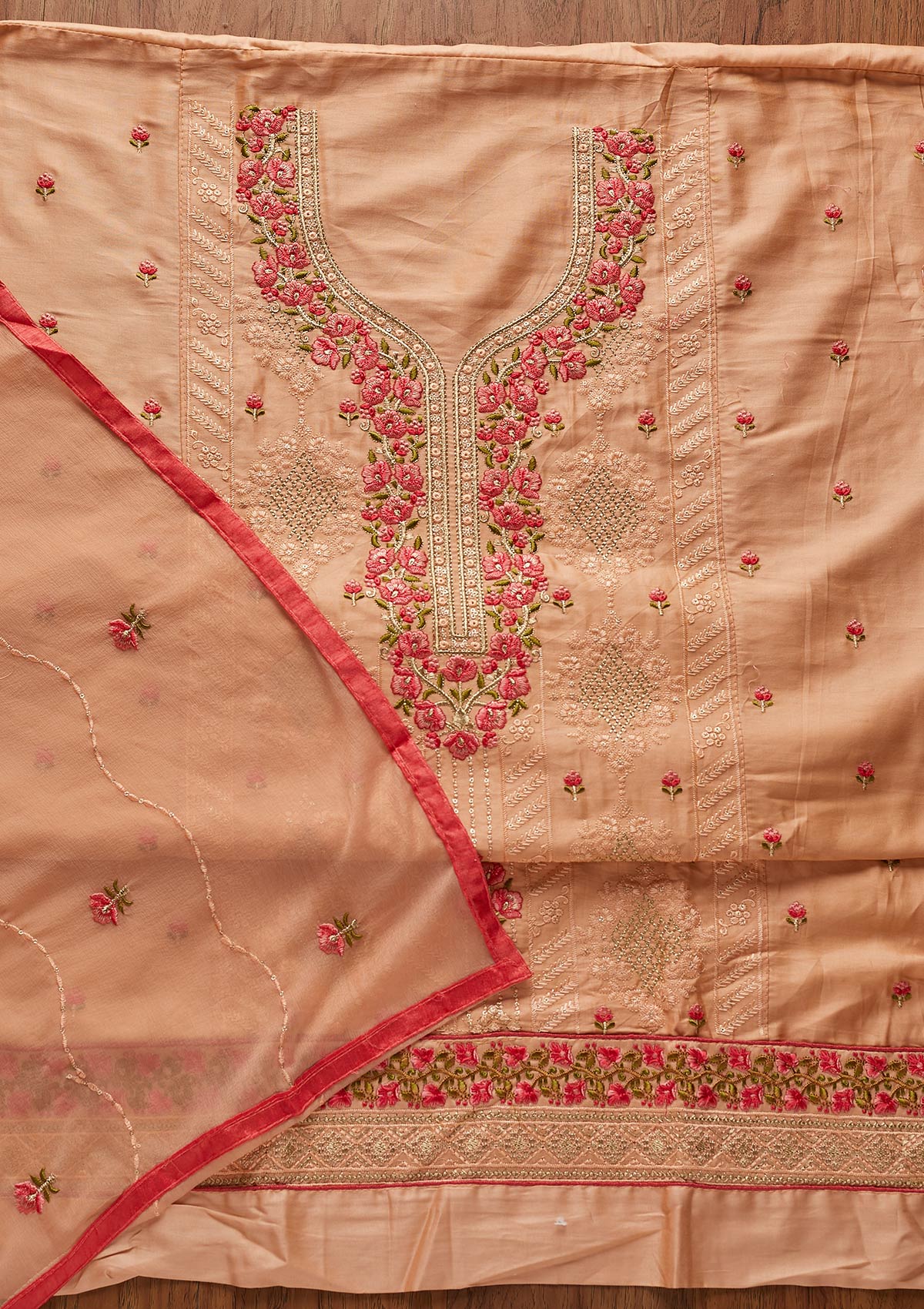 Peach Threadwork Cotton Unstitched Salwar Suit