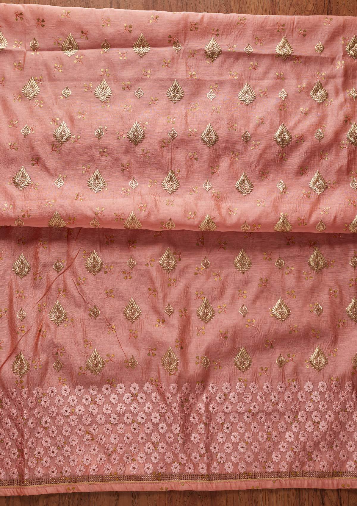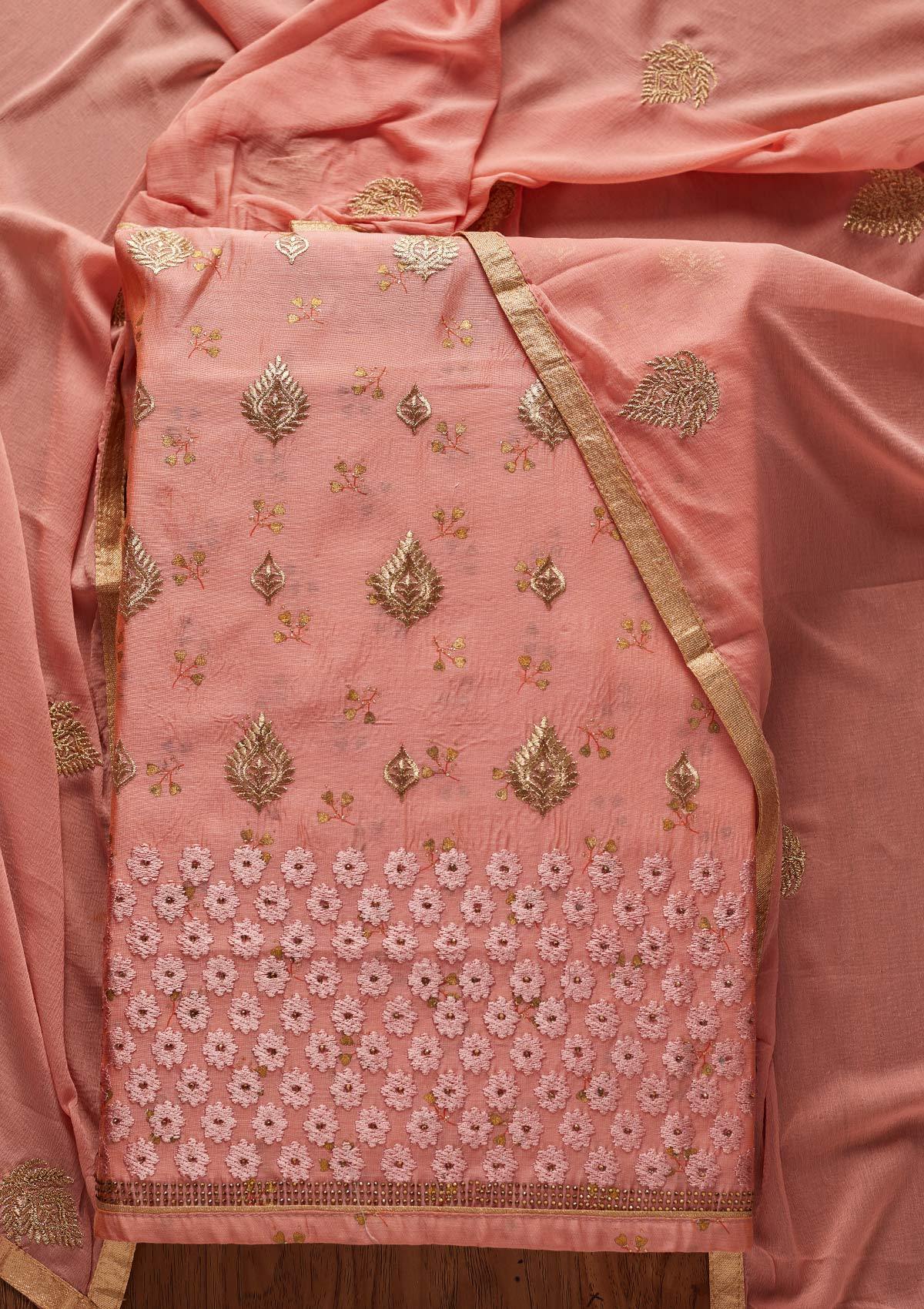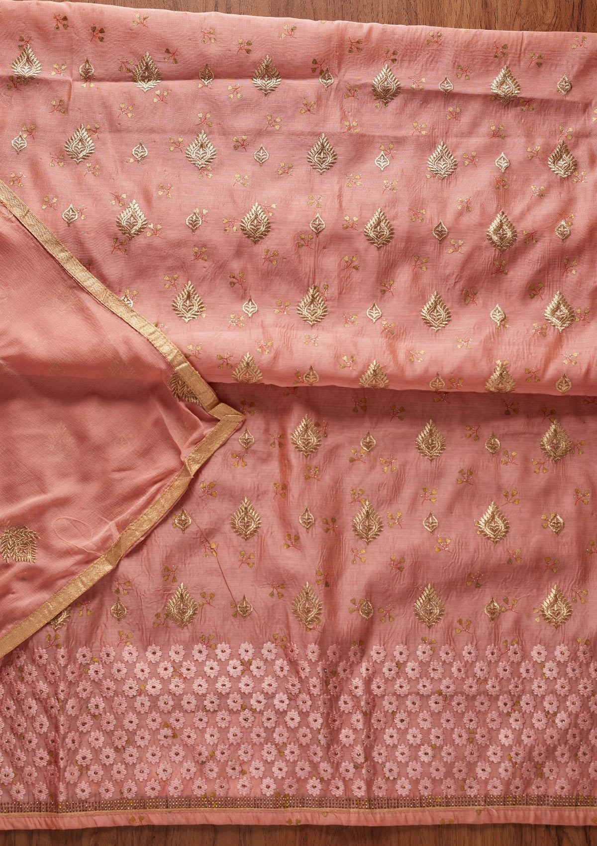 Peach Salwar Suit In Chanderi Fabric. The Salwar Suit Is Embellished With Zariwork Embroidery. Accompanied with an unstitched bottom and dupatta. Comes With The Koskii Promise Of Premium Quality.