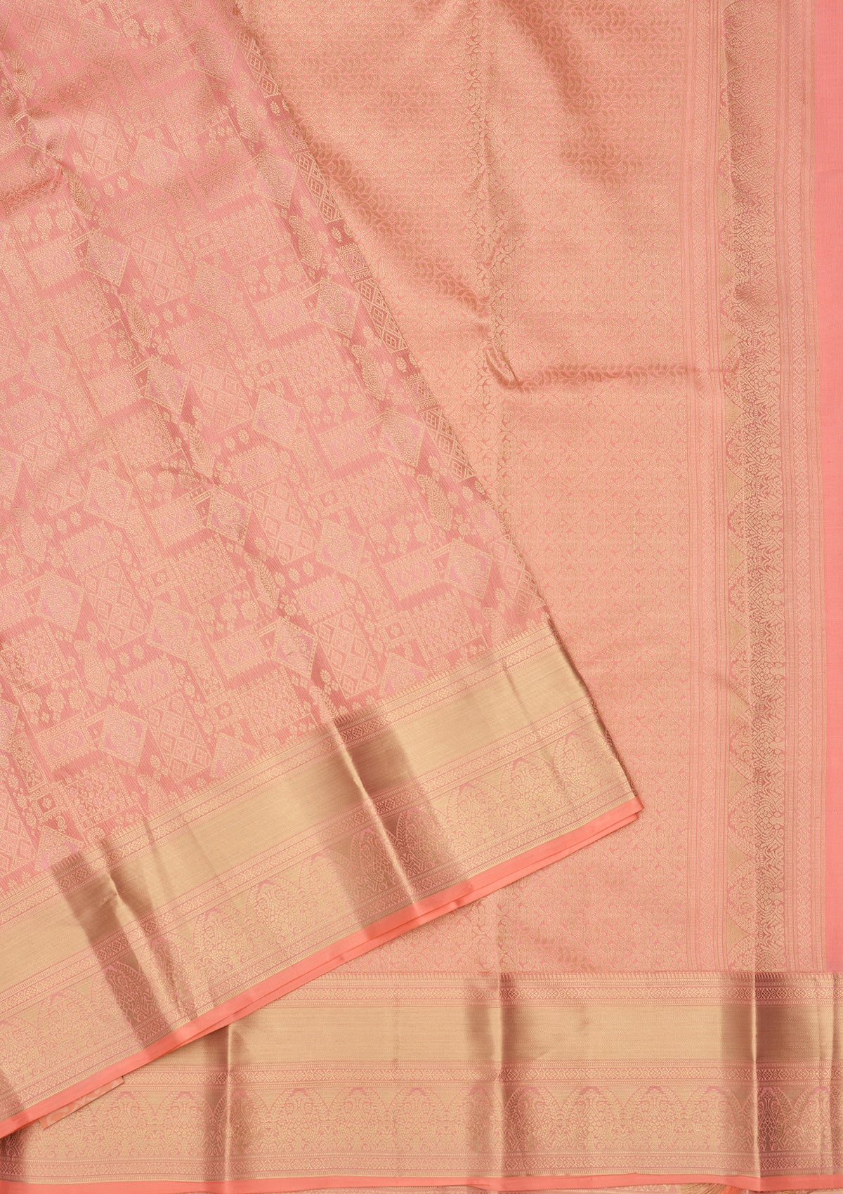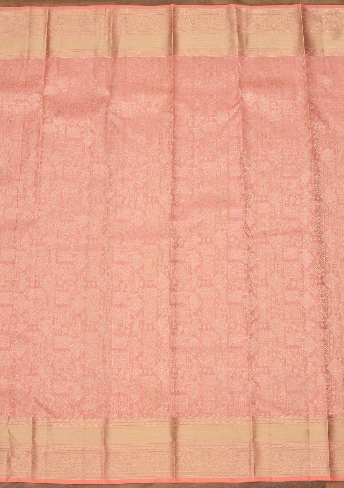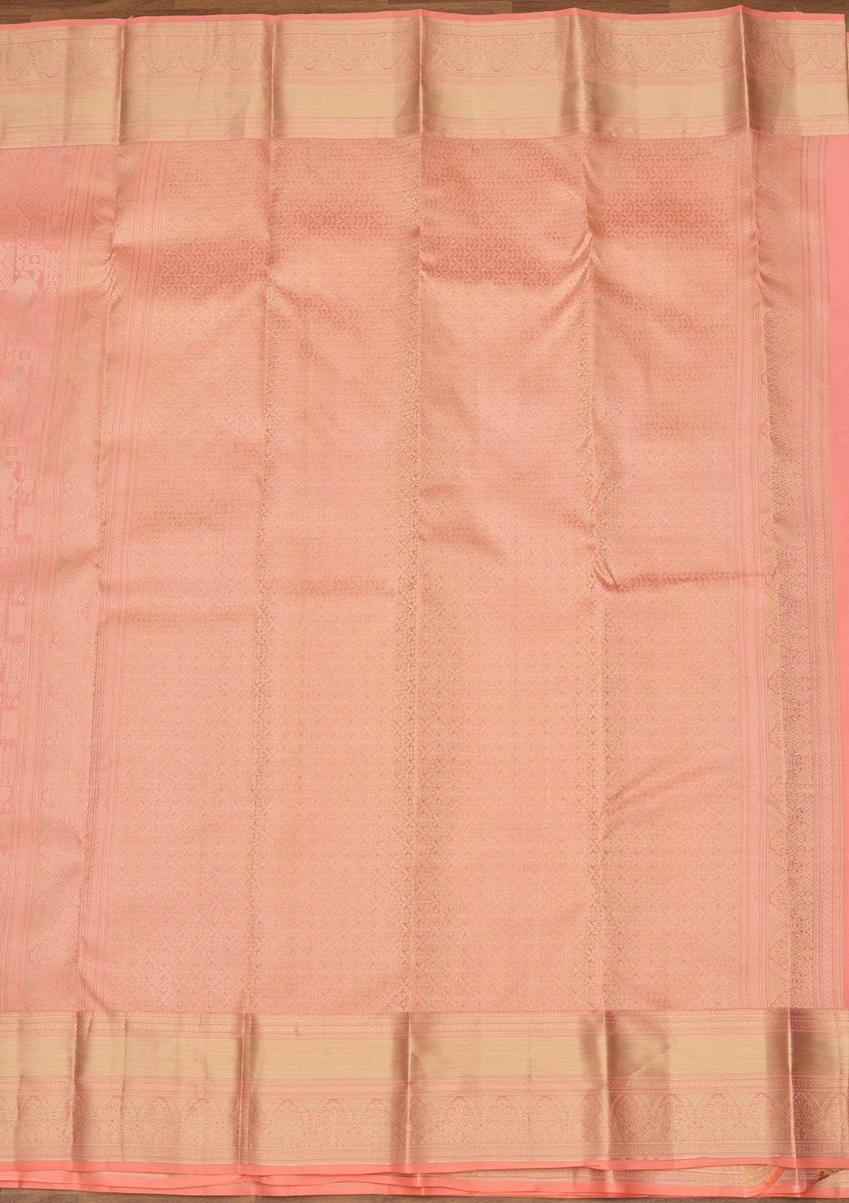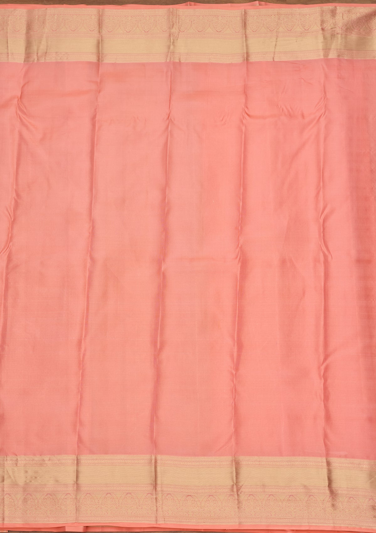 Peach Silk_Saree in Silk fabric. The Silk_Saree is elevated with Zariwork (Gold) embroidery. It comes with an Unstitched blouse. Comes with the Koskii promise of premium quality.