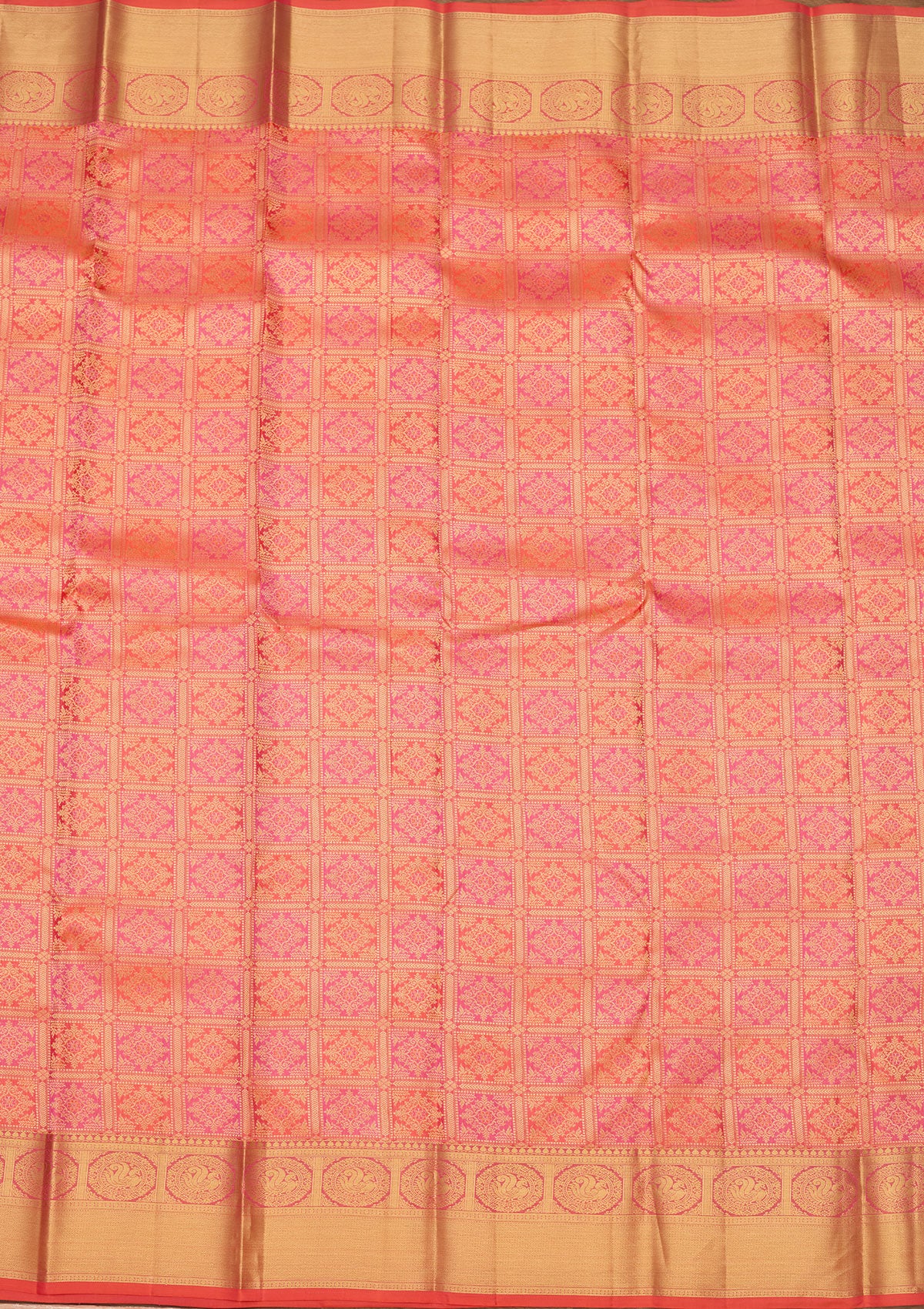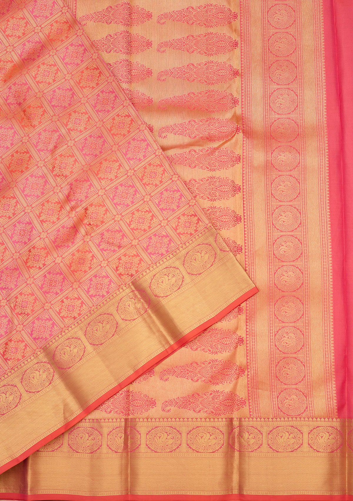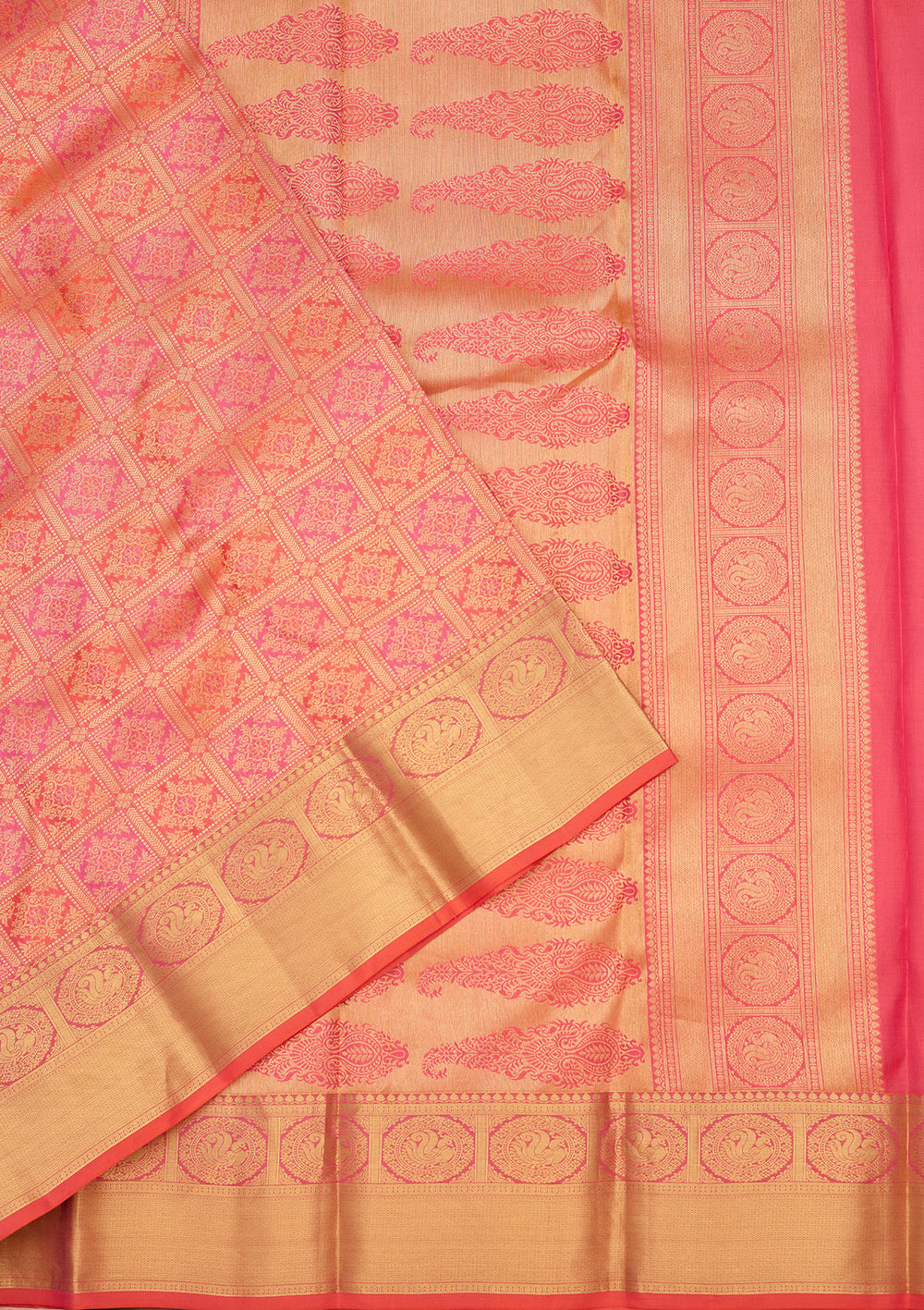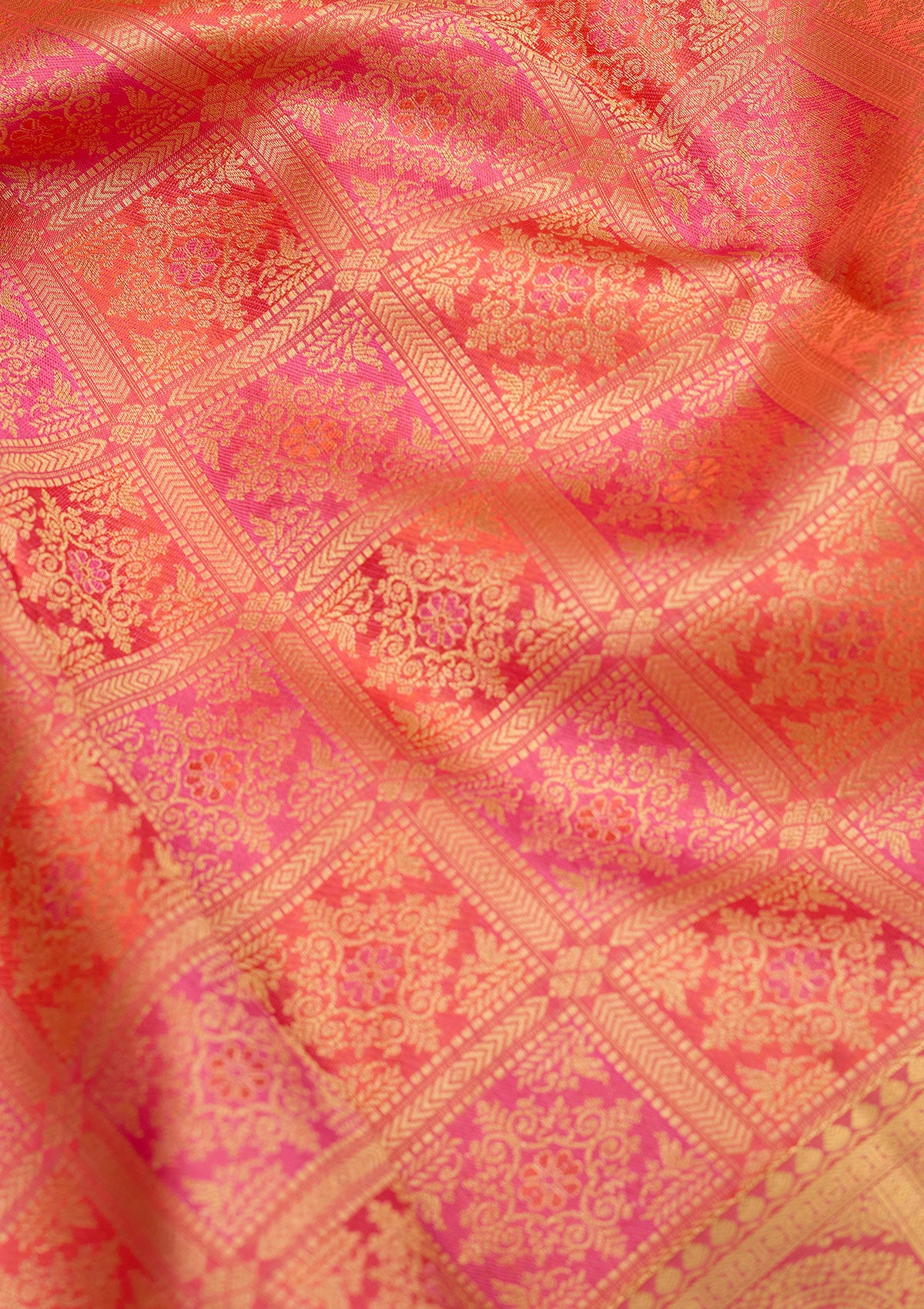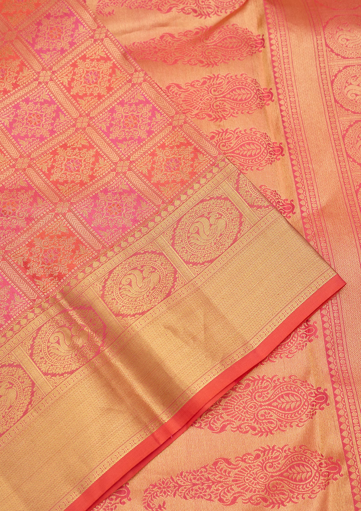 Peach Silk_Saree in Silk fabric. The Silk_Saree is elevated with Zariwork (Gold) embroidery. It comes with an Unstitched blouse. Comes with the Koskii promise of premium quality.