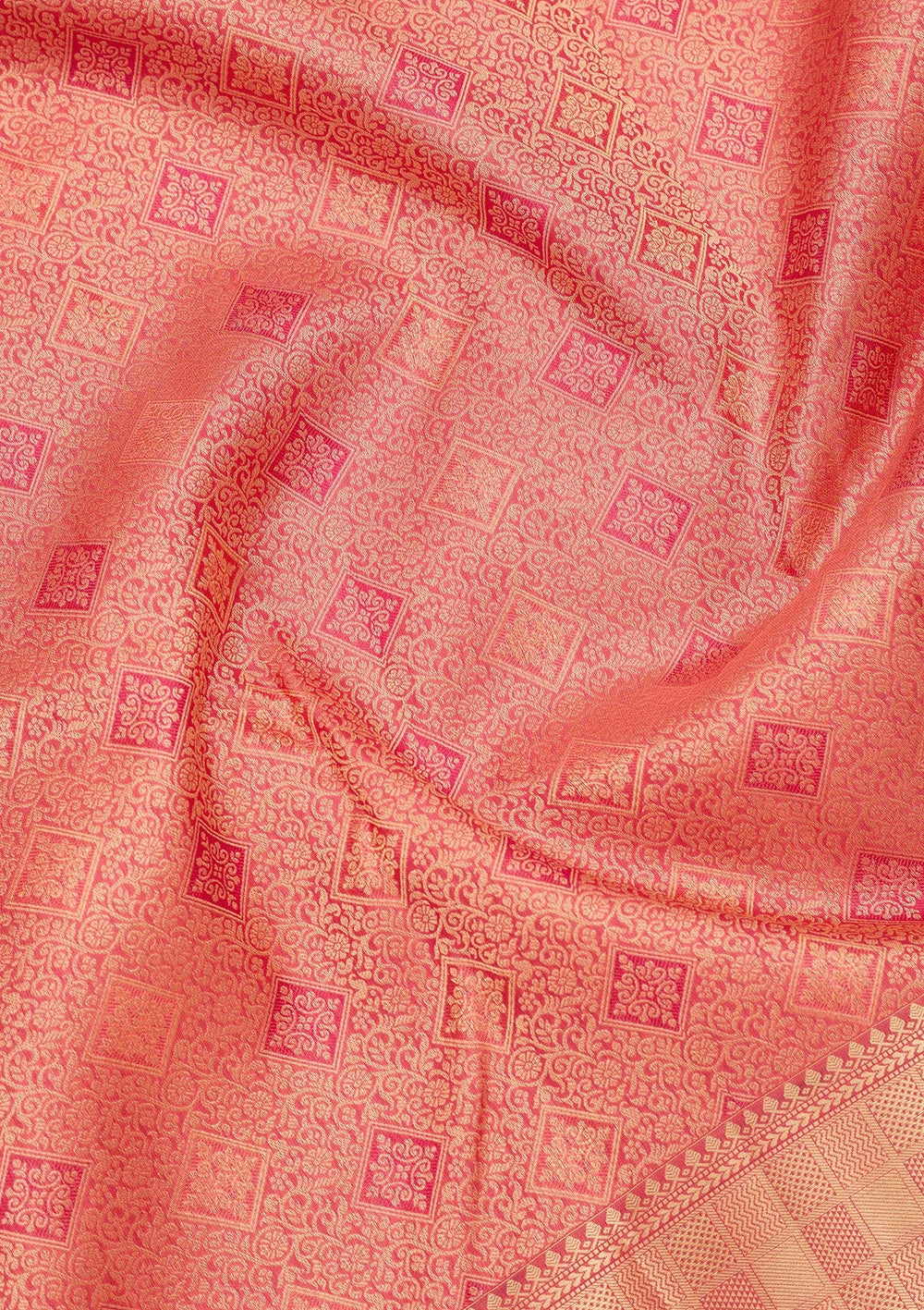 Peach Saree in Pure Silk fabric. The Saree is elevated with Zariwork embroidery. It comes with an Unstitched blouse. Comes with the Koskii promise of premium quality.