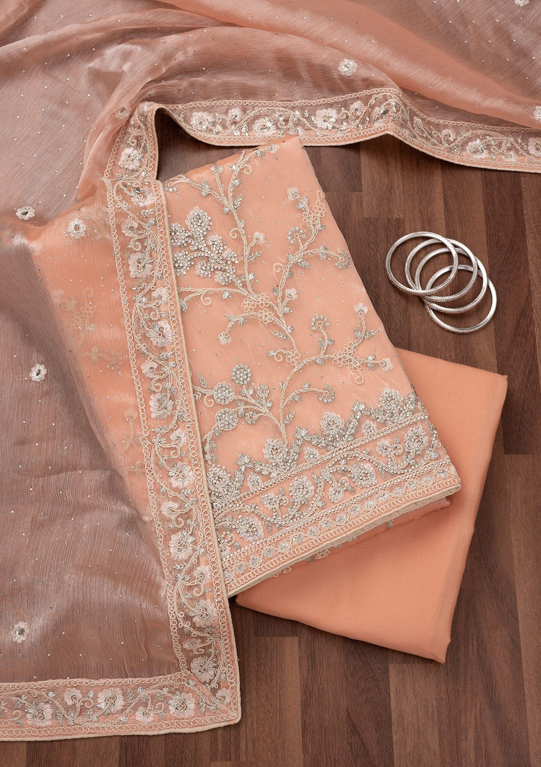 Peach Zariwork Semi Crepe Unstitched Salwar Suit-Koskii
