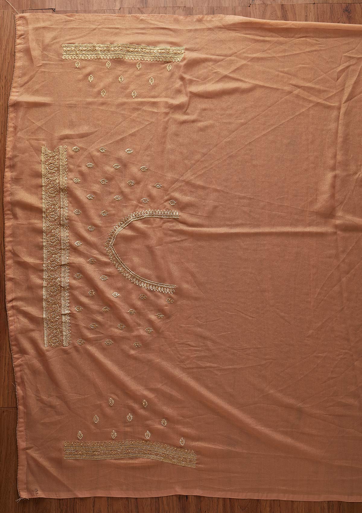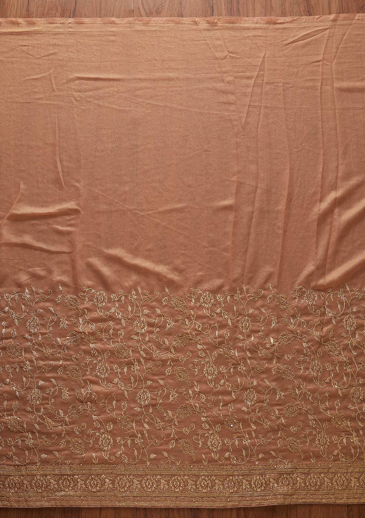 Peach Saree In Shimmer. The Saree Is Embellished With Zariwork Embroidery. Paired With A Matching Unstitched Blouse. Comes With The Koskii Promise Of Superior Quality.
