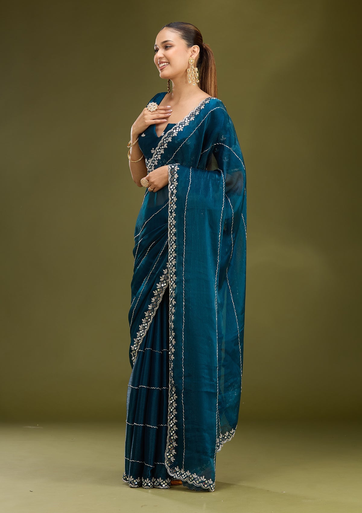 Peacock Blue Saree in Tissue fabric. The Saree is elevated with Cutdana embroidery. It comes with an Unstitched blouse. Comes with the Koskii promise of premium quality.