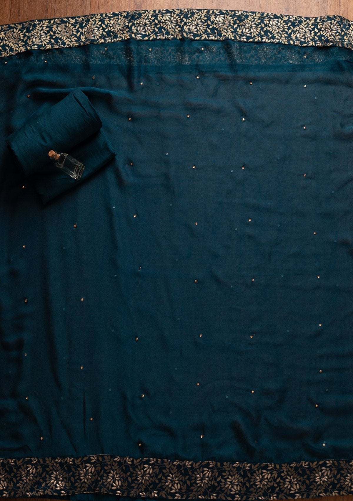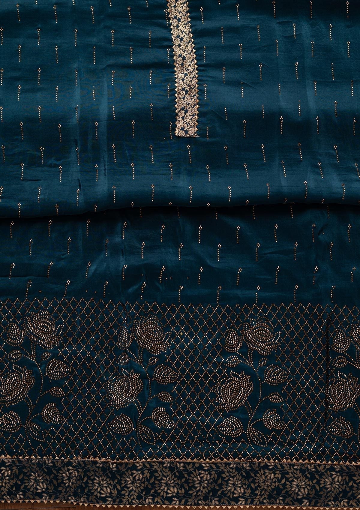 Peacock Blue Swarovski Satin Unstitched Salwar Suit