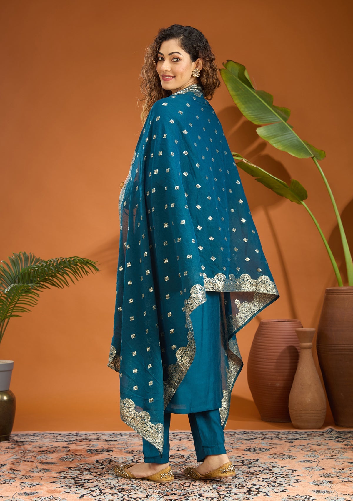 Peacock Blue Threadwork Chanderi Readymade Salwar Suit