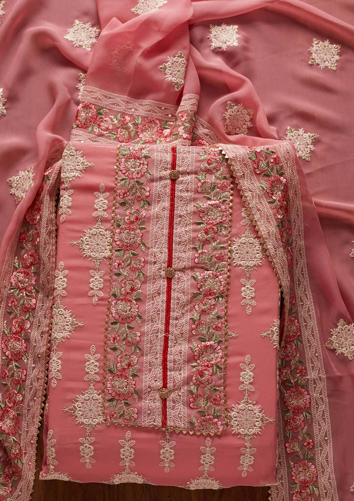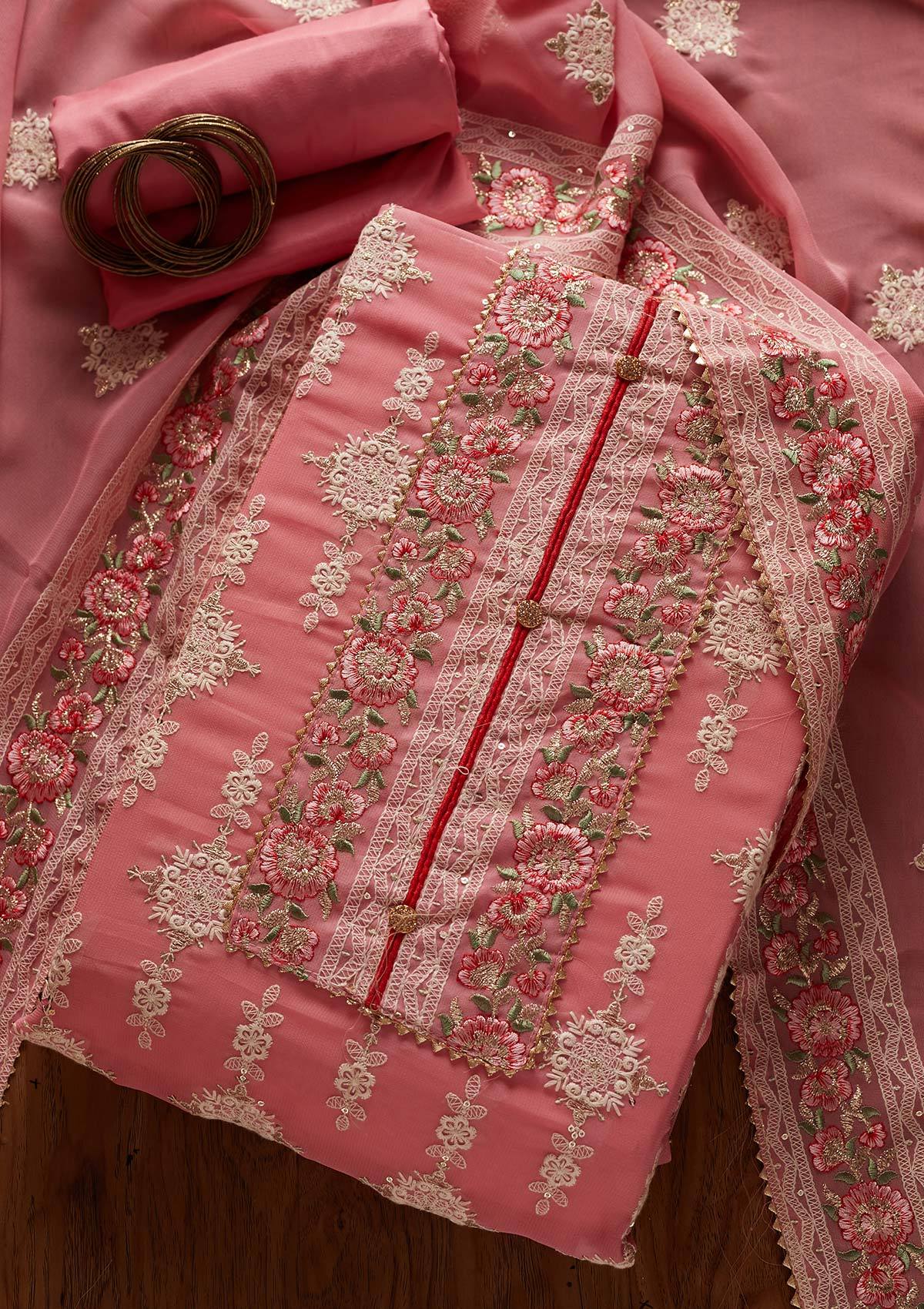 Pink Salwar Suit In Georgette Fabric. The Salwar Suit Is Embellished With Chikankari Embroidery. Accompanied with an unstitched bottom and dupatta. Comes With The Koskii Promise Of Premium Quality.