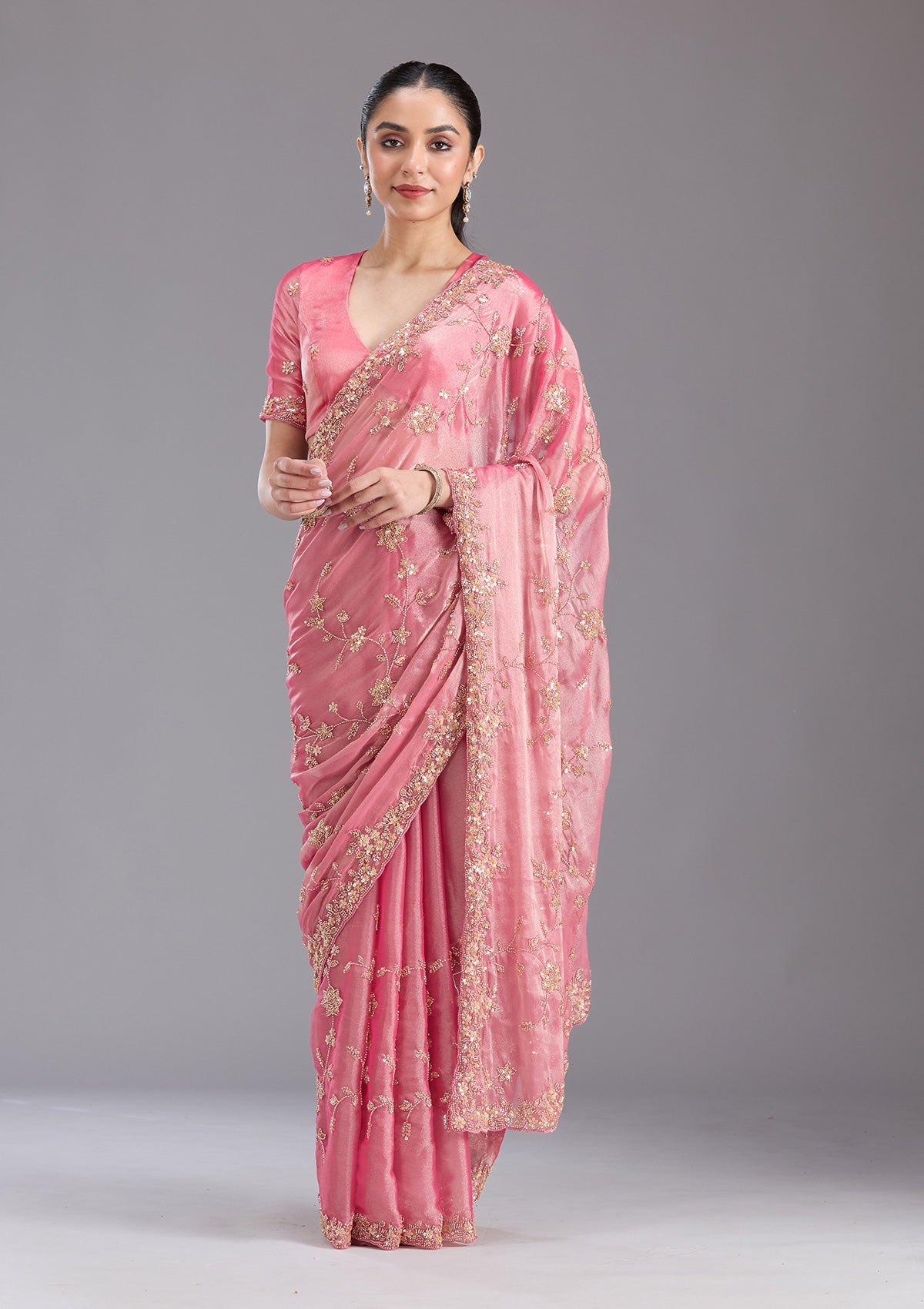 Pink Saree in Tissue fabric. The Saree is elevated with Cutdana embroidery. It comes with an Unstitched blouse. Comes with the Koskii promise of premium quality.