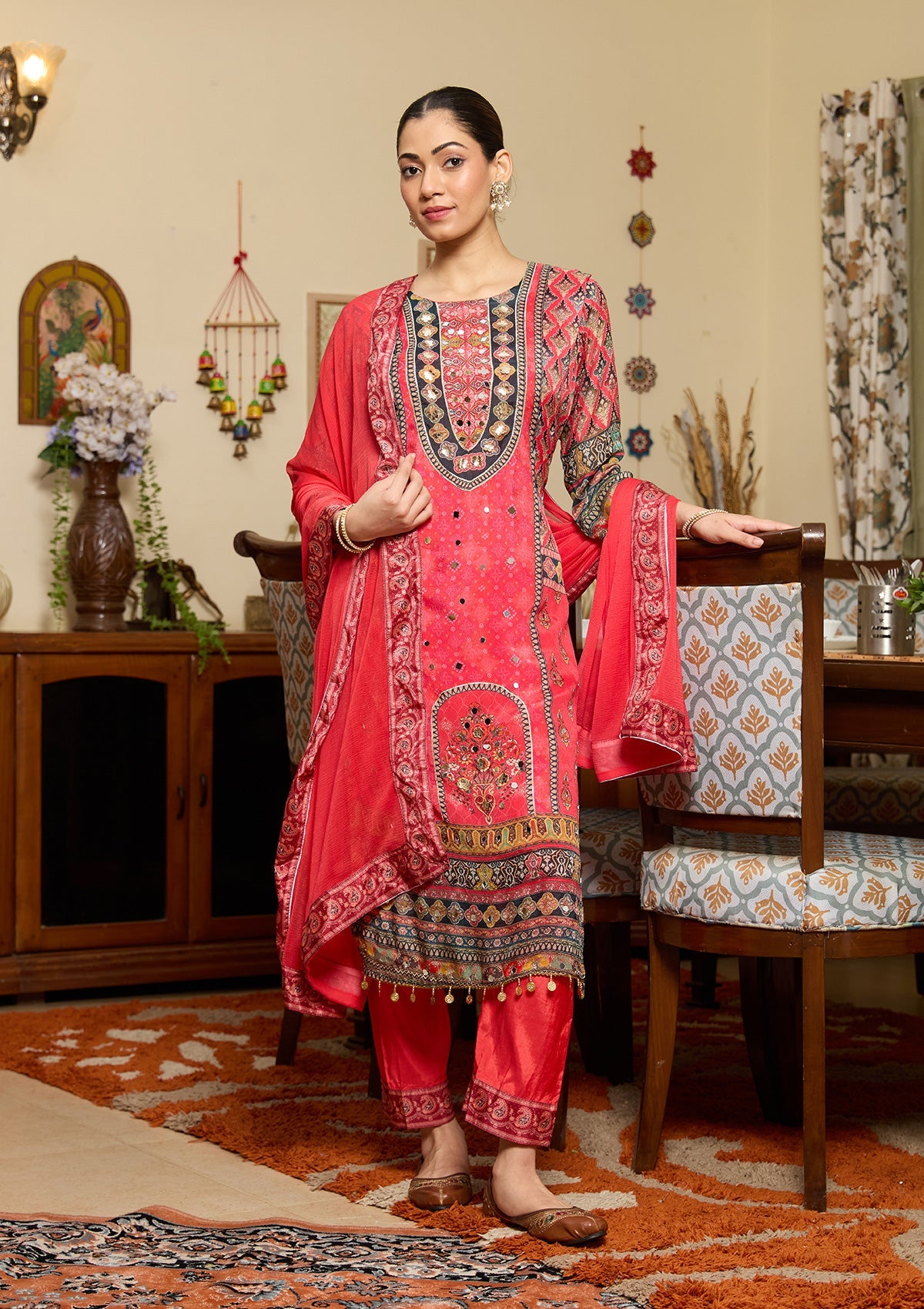 Pink Salwar Suit in Crepe fabric. The Salwar Suit is embellished with Mirrorwork embroidery. Accompanied with a bottom and dupatta. Comes with the Koskii promise of premium quality.