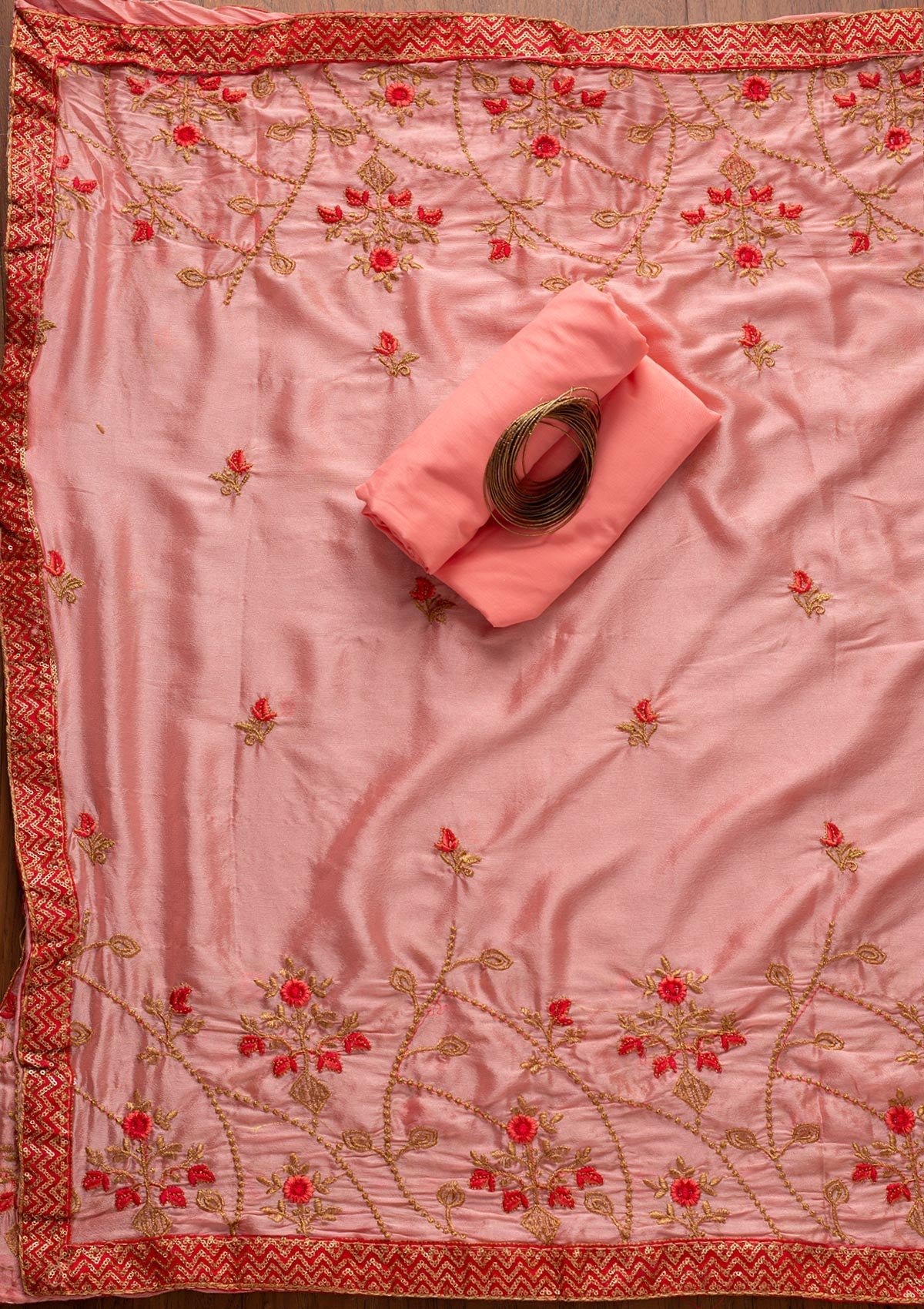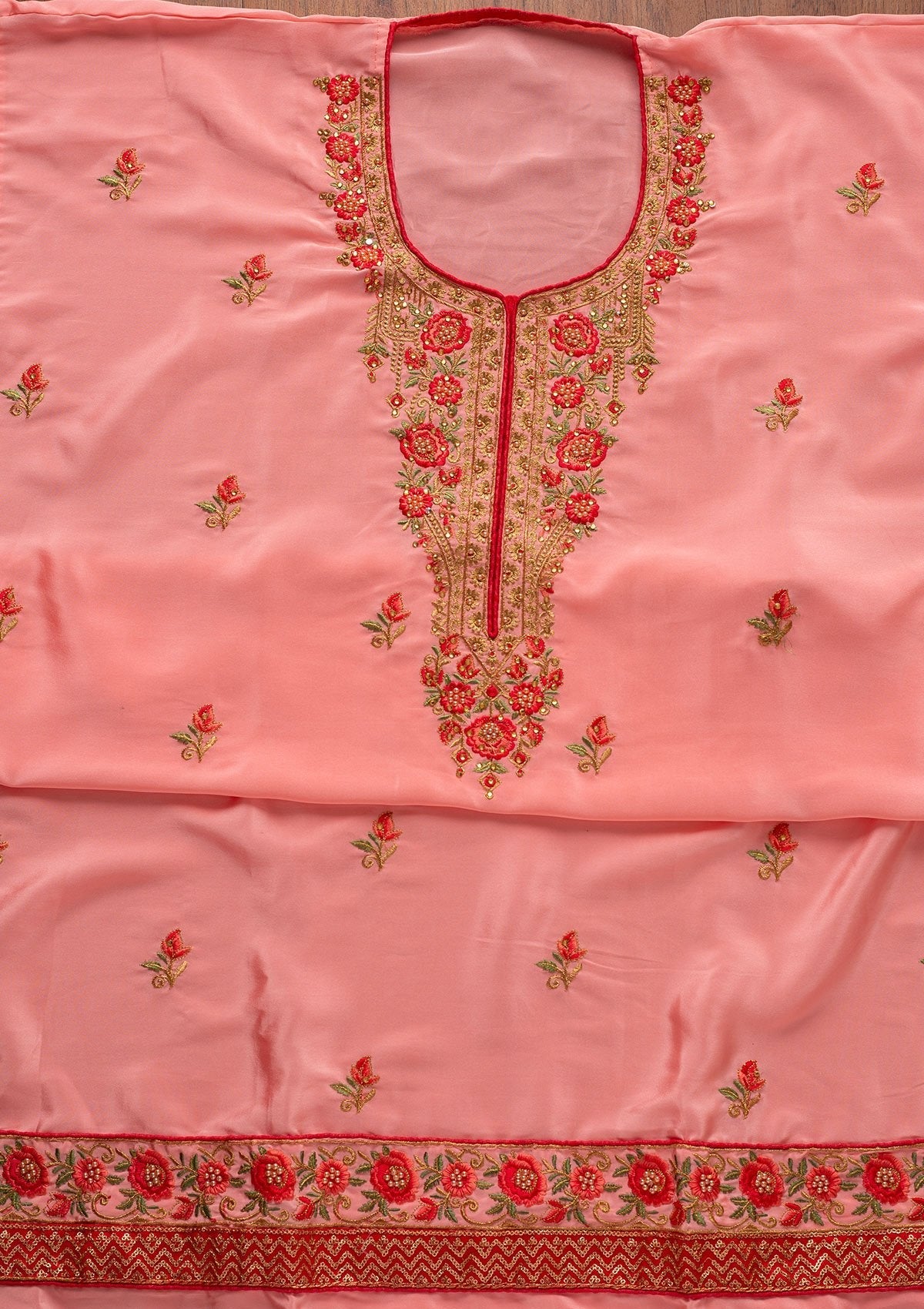 Pink Salwar Suit In Semi Crepe Fabric. The Salwar Suit Is Embellished With Pearlwork Embroidery. Accompanied with an unstitched bottom and dupatta. Comes With The Koskii Promise Of Premium Quality.