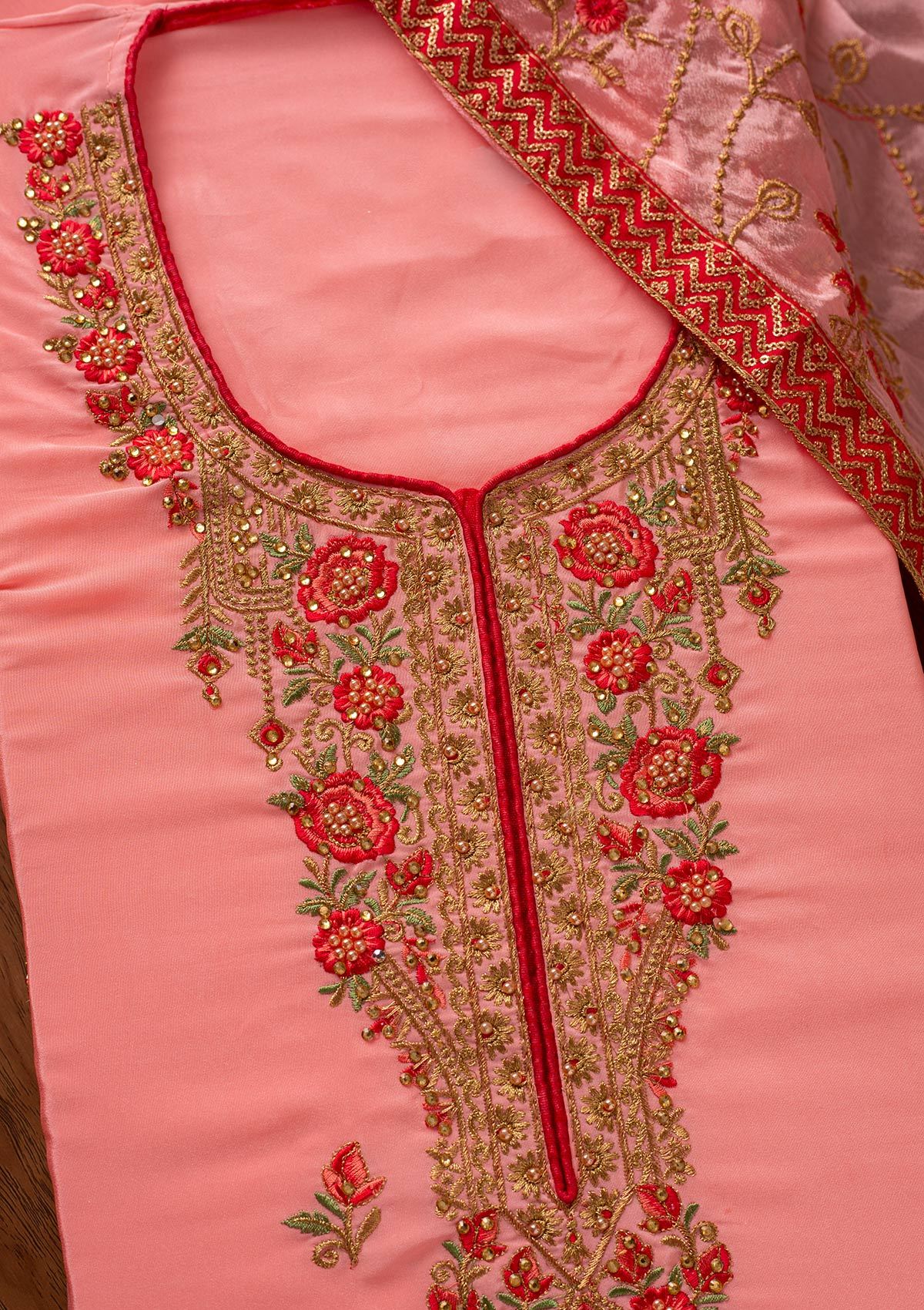 Pink Pearlwork Semi Crepe Unstitched Salwar Suit