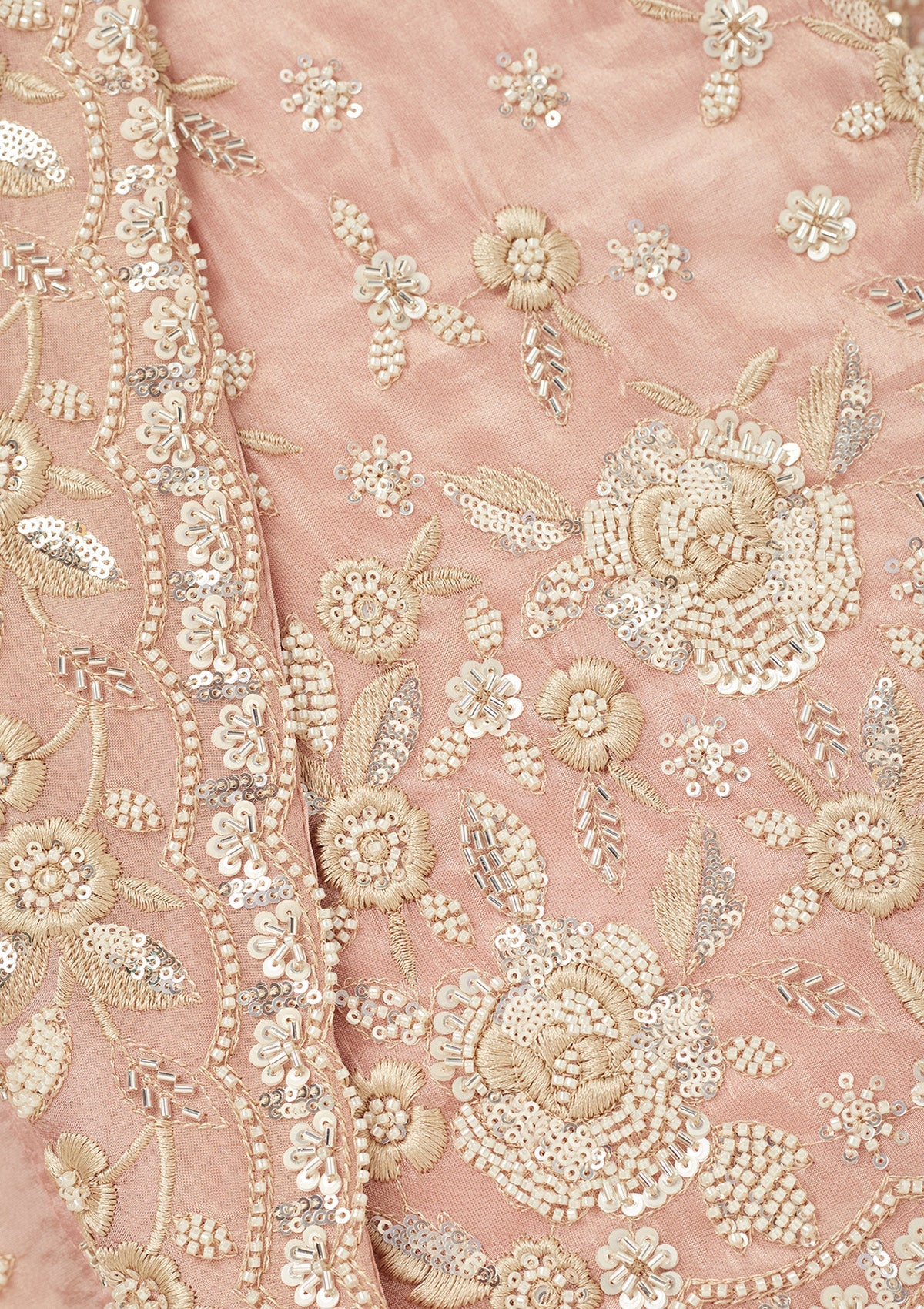 Pink Salwar_US in Tissue fabric. The Salwar_US is embellished with Silver Stonework embroidery. Accompanied with a bottom and dupatta. Comes with the Koskii promise of premium quality.