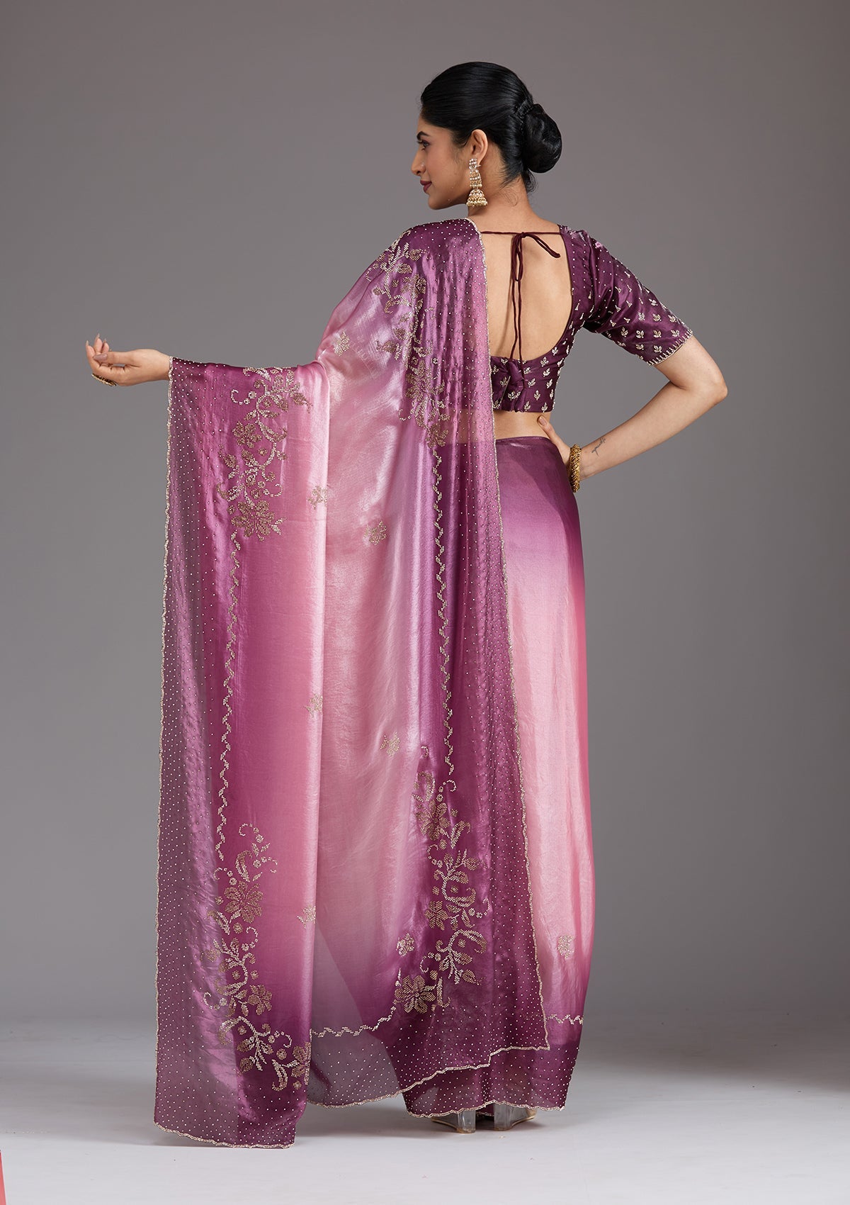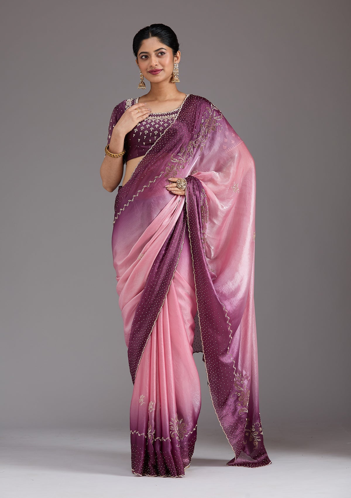 Pink Saree in Tissue fabric. The Saree is elevated with Stonework (Gold) embroidery. It comes with an Unstitched blouse. Comes with the Koskii promise of premium quality.