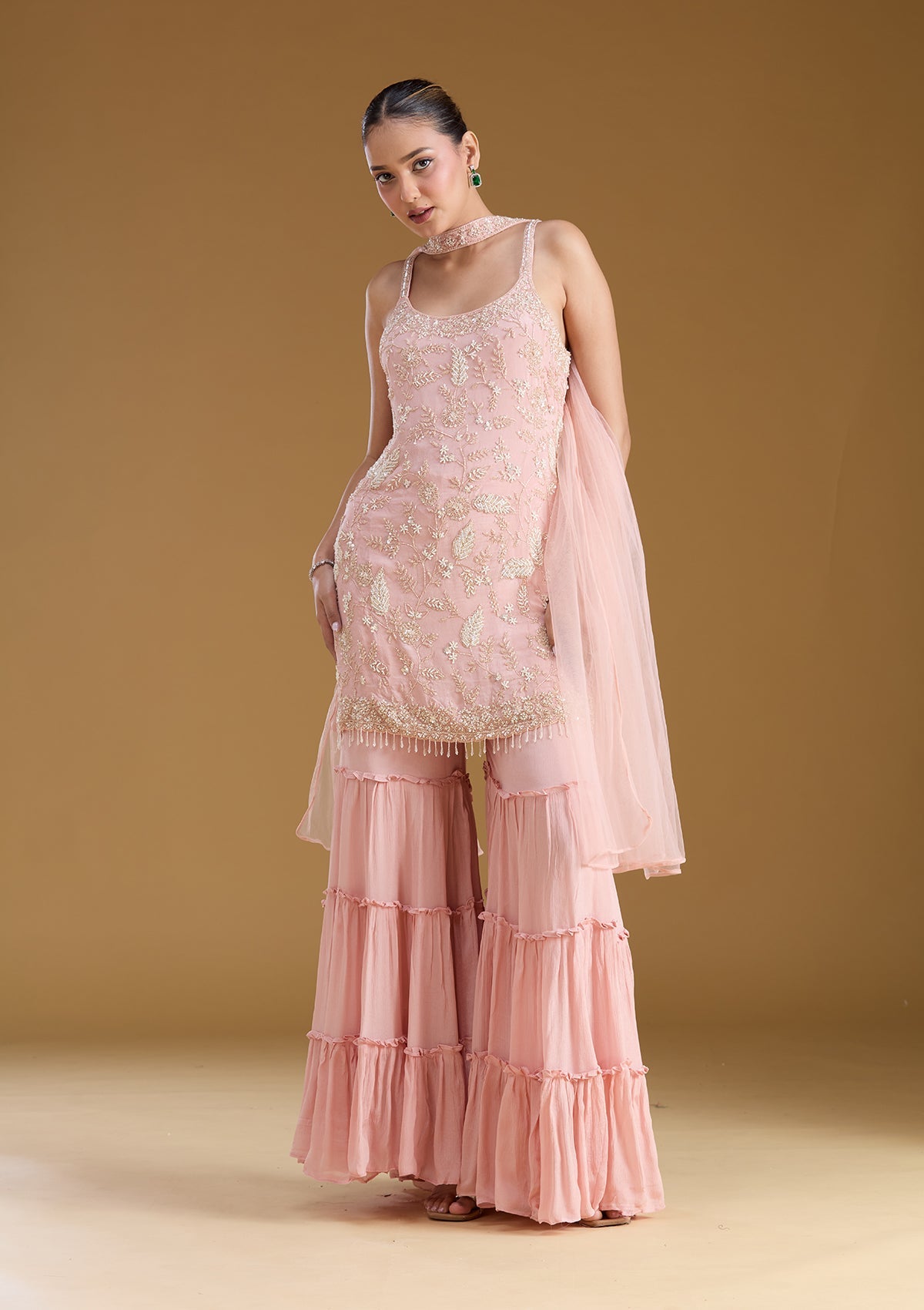Pink Salwar_RM in Crepe fabric. The Salwar_RM is embellished with Threadwork embroidery. Accompanied with a bottom and dupatta. Comes with the Koskii promise of premium quality.