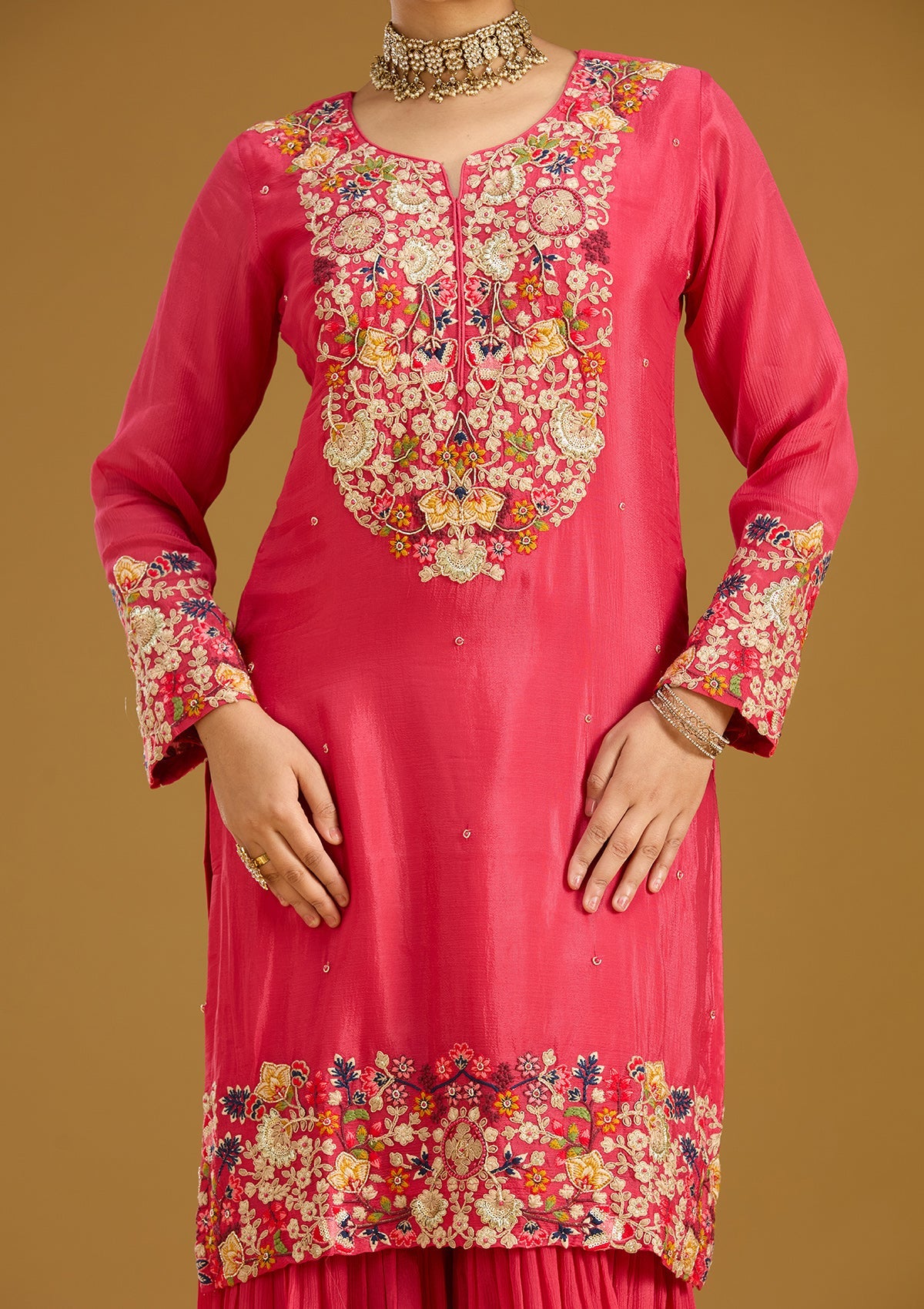 Pink Salwar Suit in Soft Raw Silk fabric. The Salwar Suit is embellished with Threadwork embroidery. Accompanied with a bottom and dupatta. Comes with the Koskii promise of premium quality.