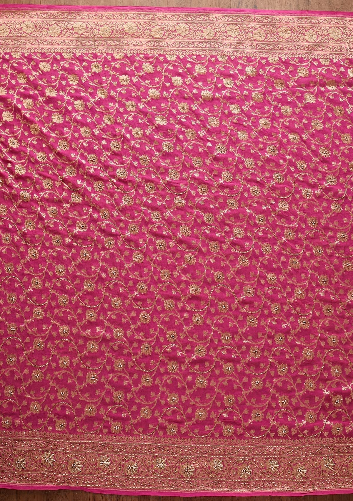Pink Saree In Georgette. The Saree Is Embellished With Zardosi Embroidery. Paired With A Matching Unstitched Blouse. Comes With The Koskii Promise Of Superior Quality.