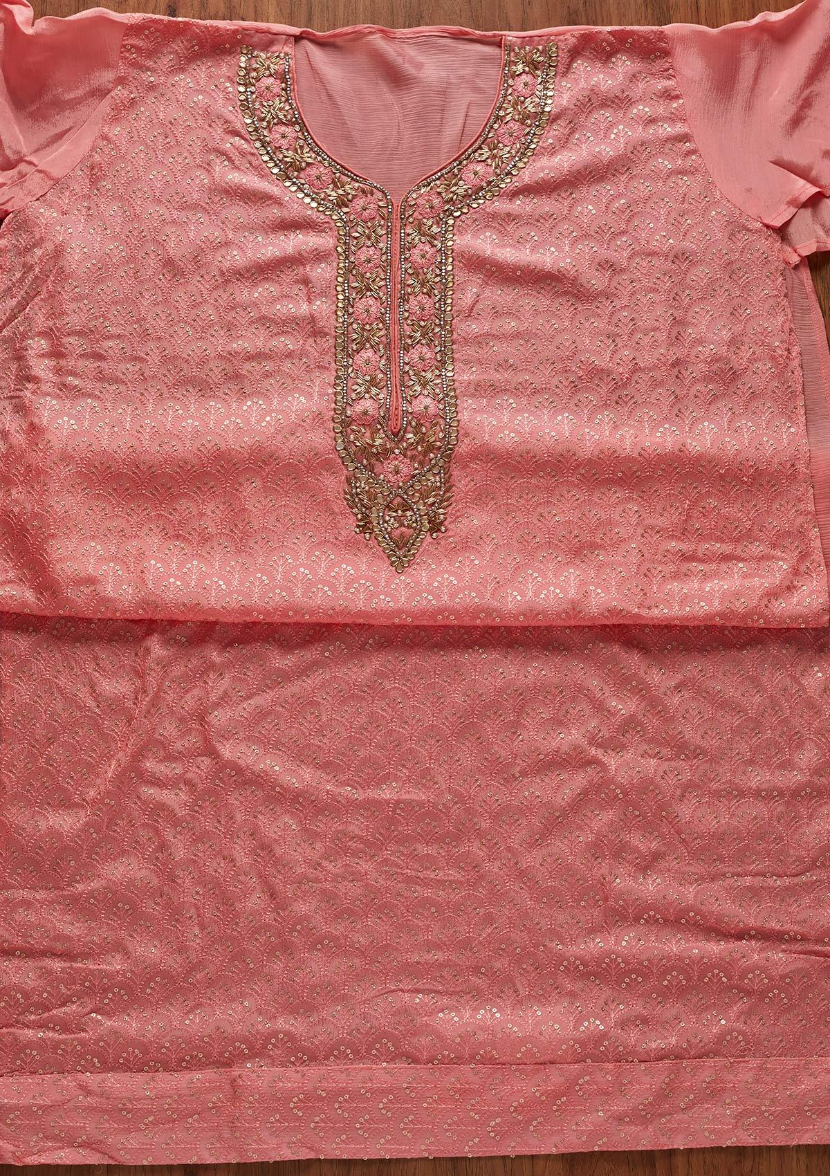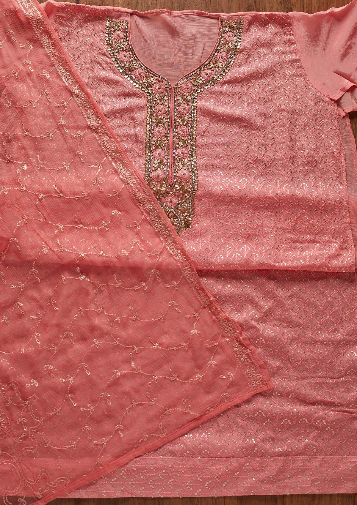 Pink Salwar Suit In Semi Crepe Fabric. The Salwar Suit Is Embellished With Zardosi Embroidery. Accompanied with an unstitched bottom and dupatta. Comes With The Koskii Promise Of Premium Quality.