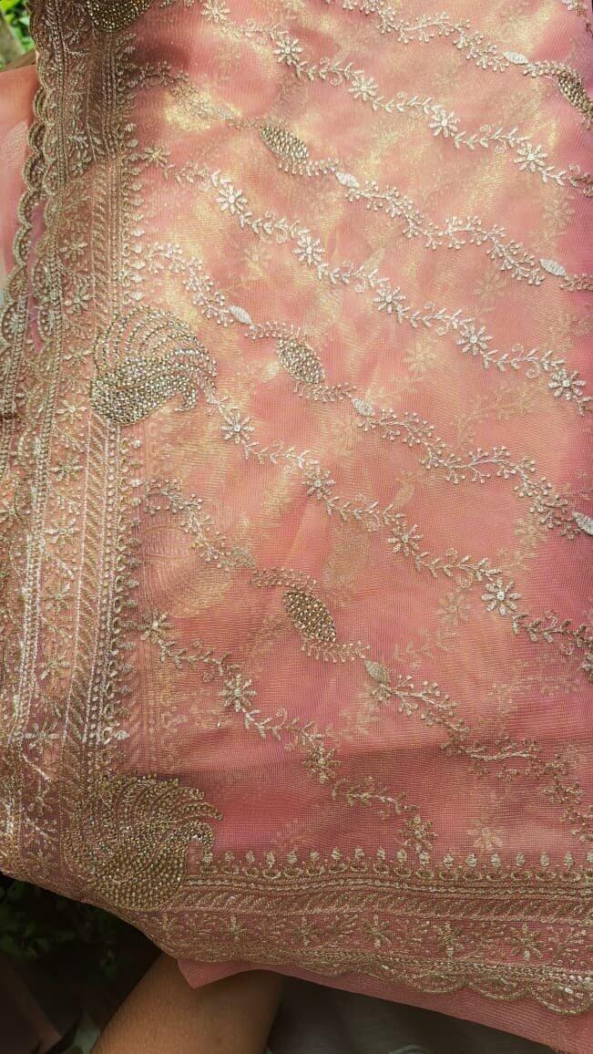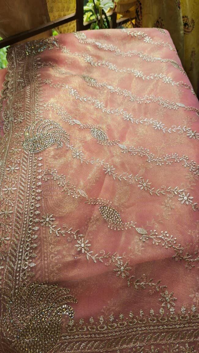 Ignite your wardrobe with Koskii’s dazzle in this pink tissue saree, adorned with opulent gold zari embroidery that weaves a tale of elegance and charm. This expressive piece caters to the spirited woman, promising to envelop you in a radiance suited for any high-spirited gathering or cultural festivity. Feel the embrace of luxury and the flutter of delicate tissue as you make every moment a vibrant celebration of style.