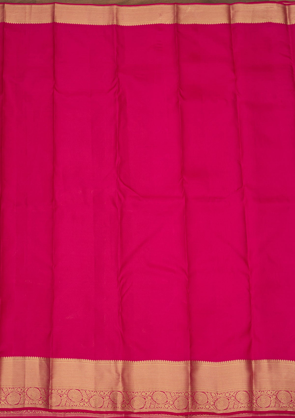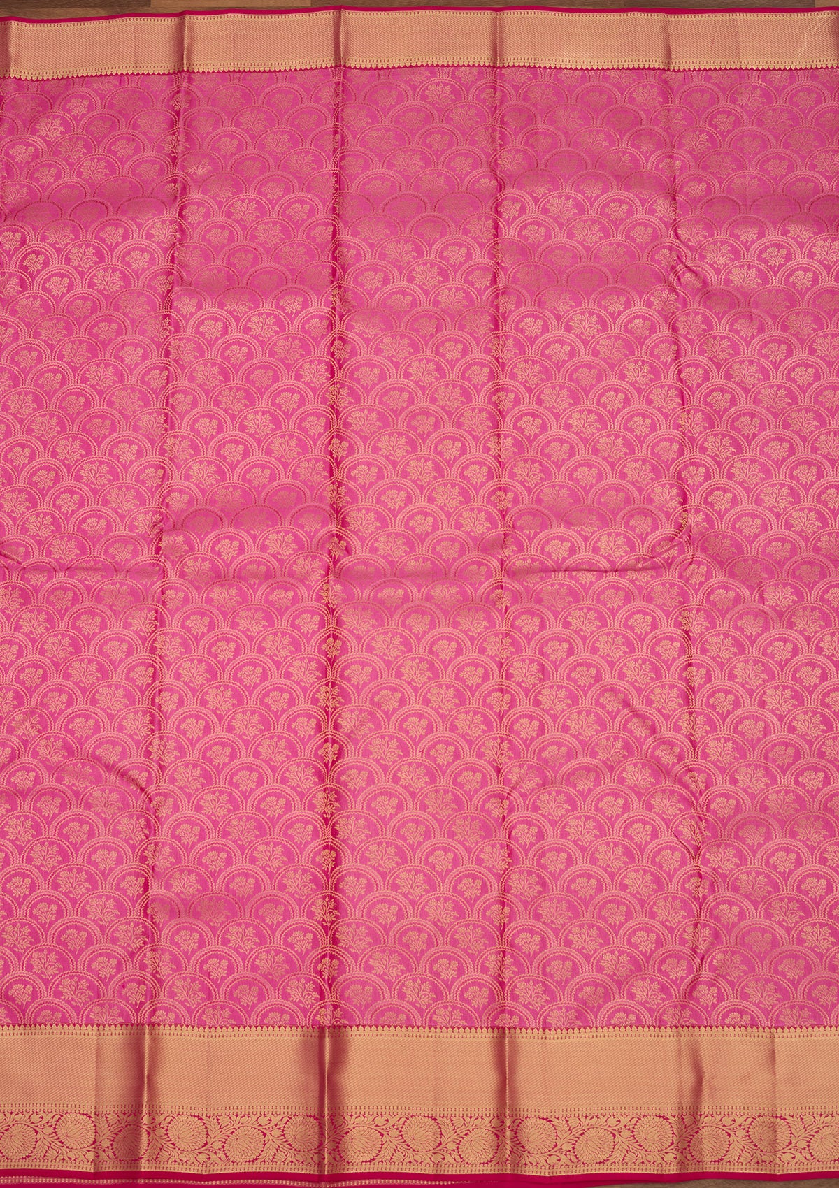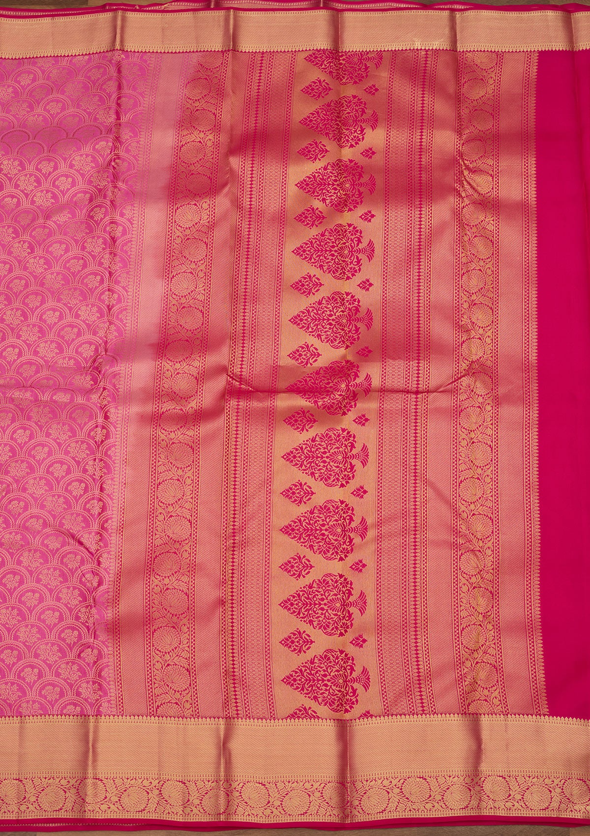 Pink Silk_Saree in Silk fabric. The Silk_Saree is elevated with Zariwork (Gold) embroidery. It comes with an Unstitched blouse. Comes with the Koskii promise of premium quality.