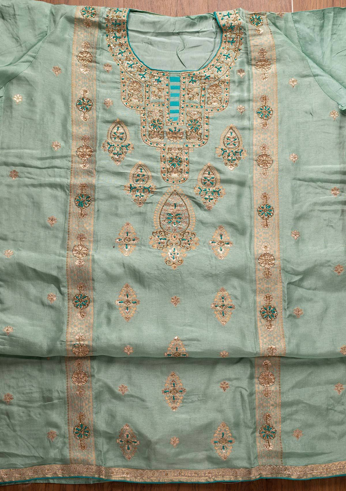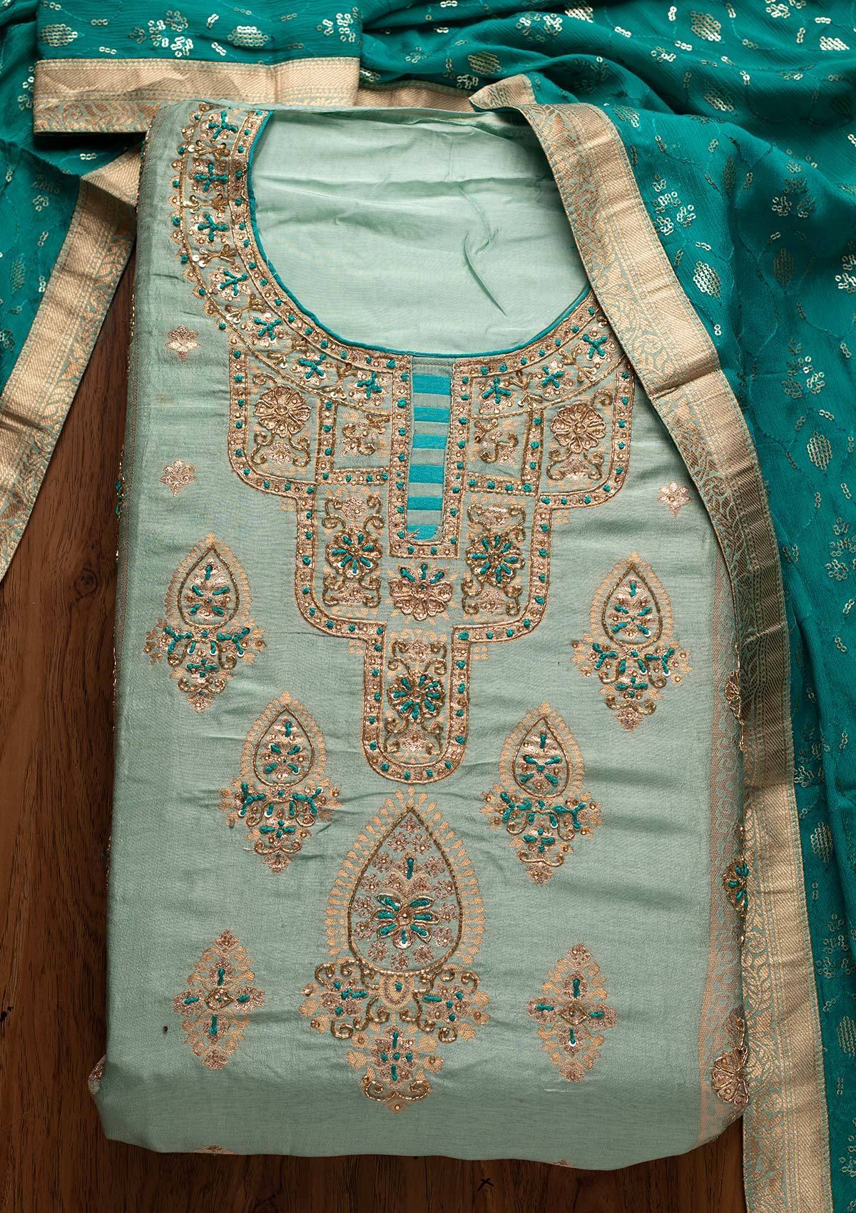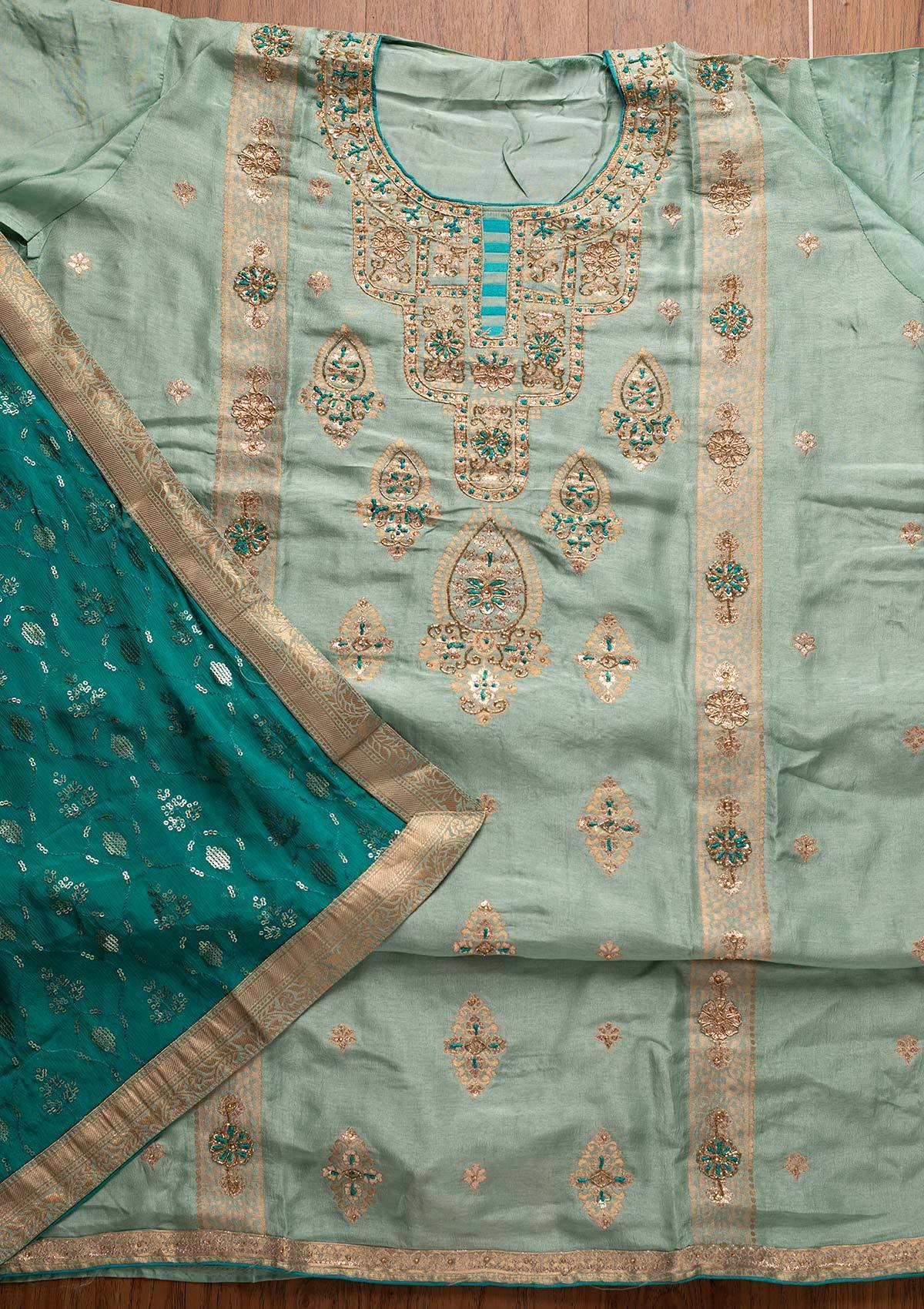 Pista Green Salwar Suit In Banarasi Fabric. The Salwar Suit Is Embellished With Cutdana Embroidery. Accompanied with an unstitched bottom and dupatta. Comes With The Koskii Promise Of Premium Quality.