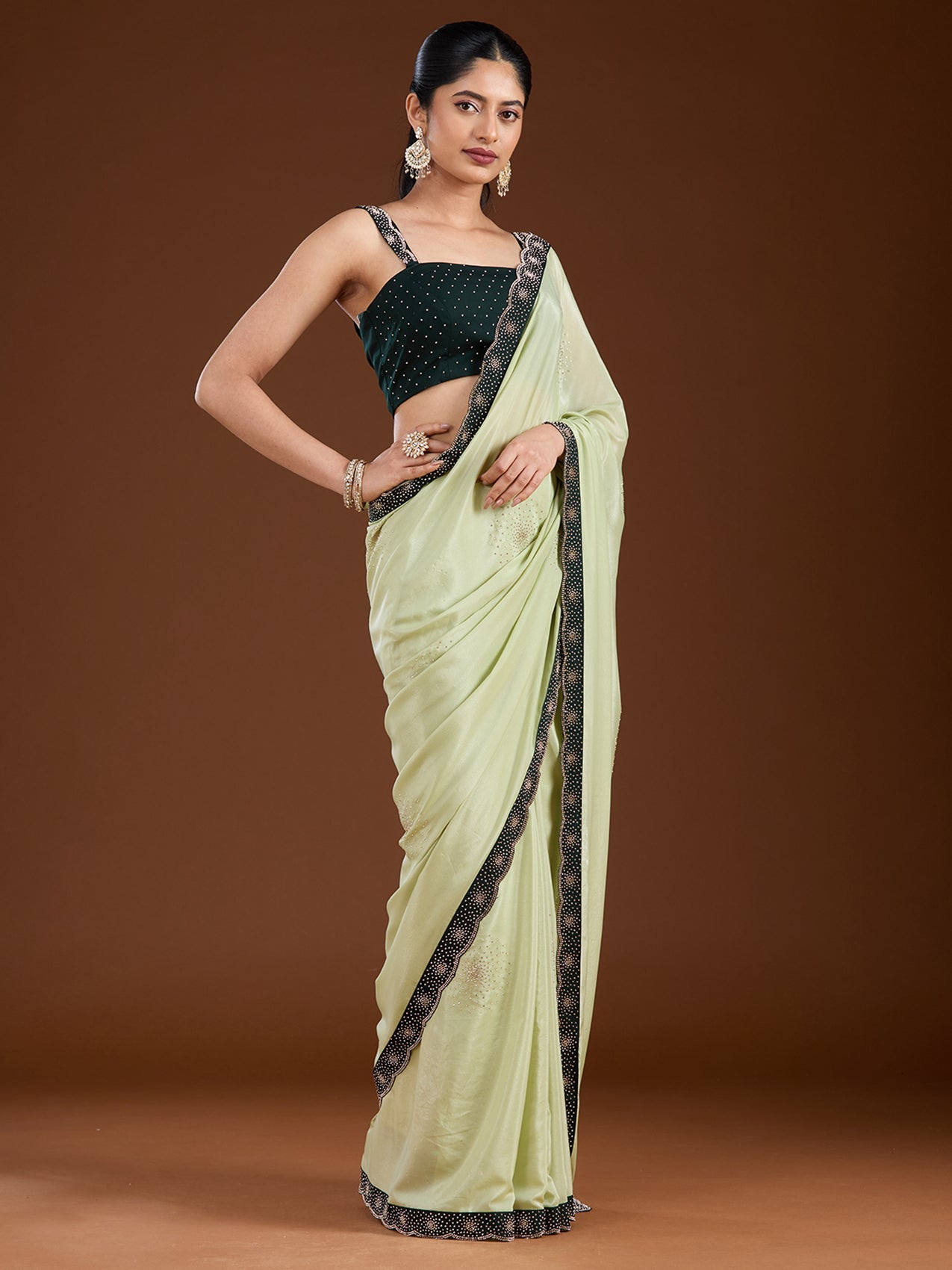Pista Green Saree in Velvet fabric. The Saree is elevated with Stonework (Silver) embroidery. It comes with an Unstitched blouse. Comes with the Koskii promise of premium quality.