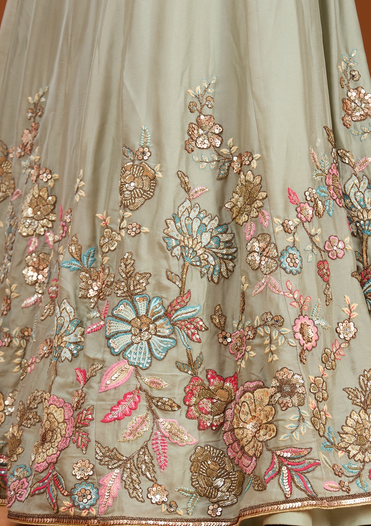 Pista Green Readymade Lehenga in Georgette fabric. The Lehenga is embellished with Threadwork embroidery. Accompanied with an Readymade blouse and dupatta. Comes with the Koskii promise of premium quality.