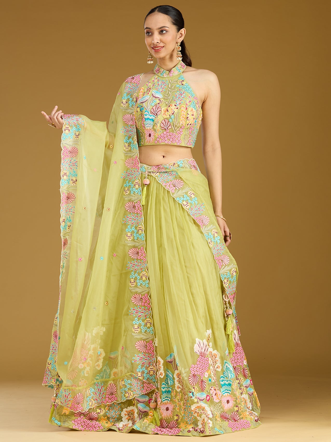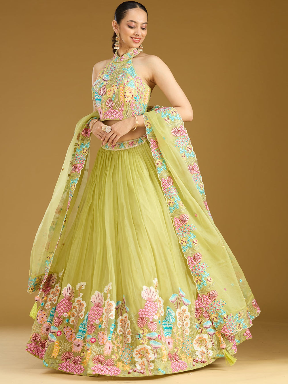 Pista Green Readymade Lehenga in Organza fabric. The Lehenga is embellished with Threadwork embroidery. Accompanied with an Readymade blouse and dupatta. Comes with the Koskii promise of premium quality.