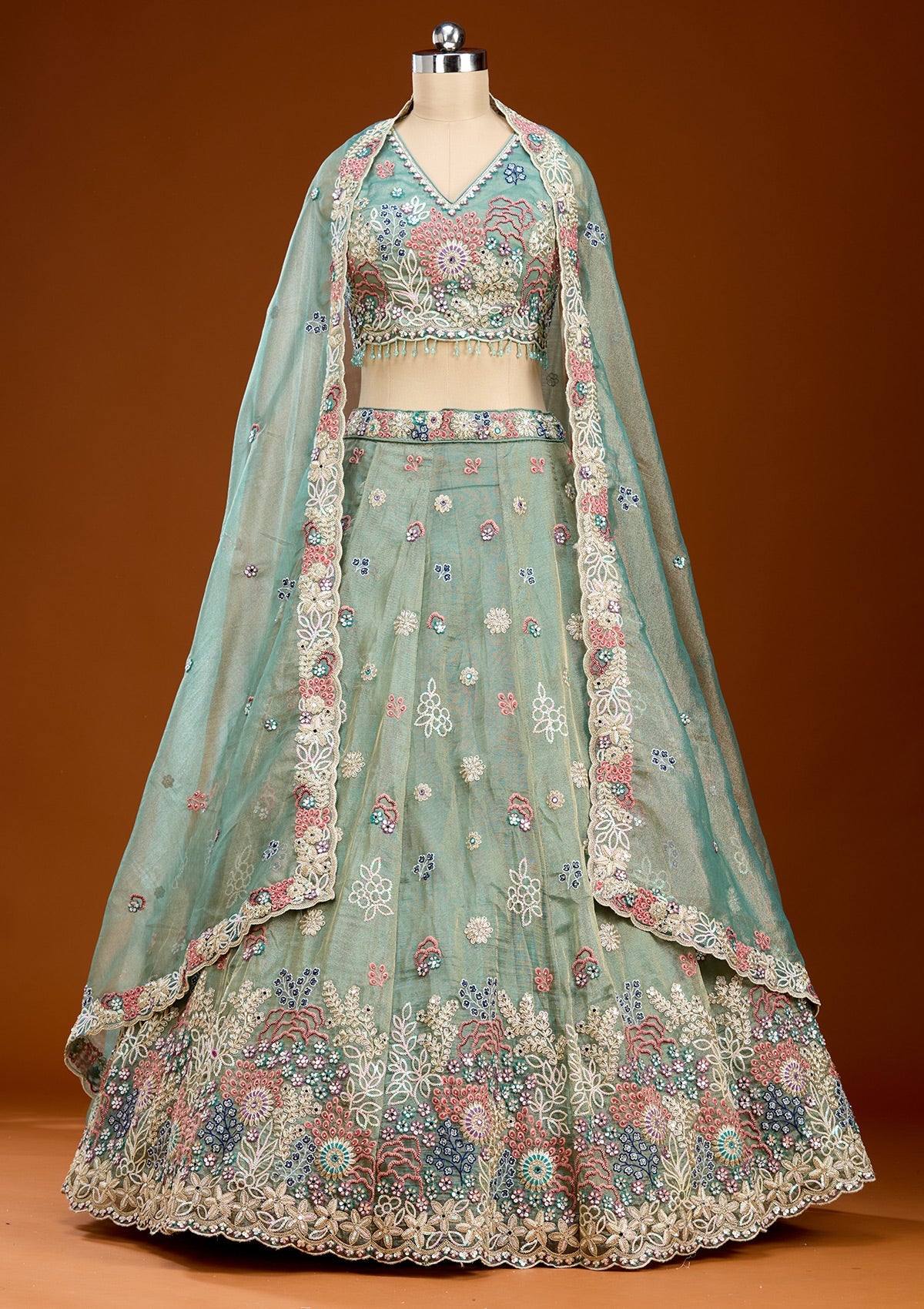 Pista Green Readymade Lehenga in Organza fabric. The Lehenga is embellished with Threadwork embroidery. Accompanied with an Readymade blouse and dupatta. Comes with the Koskii promise of premium quality.