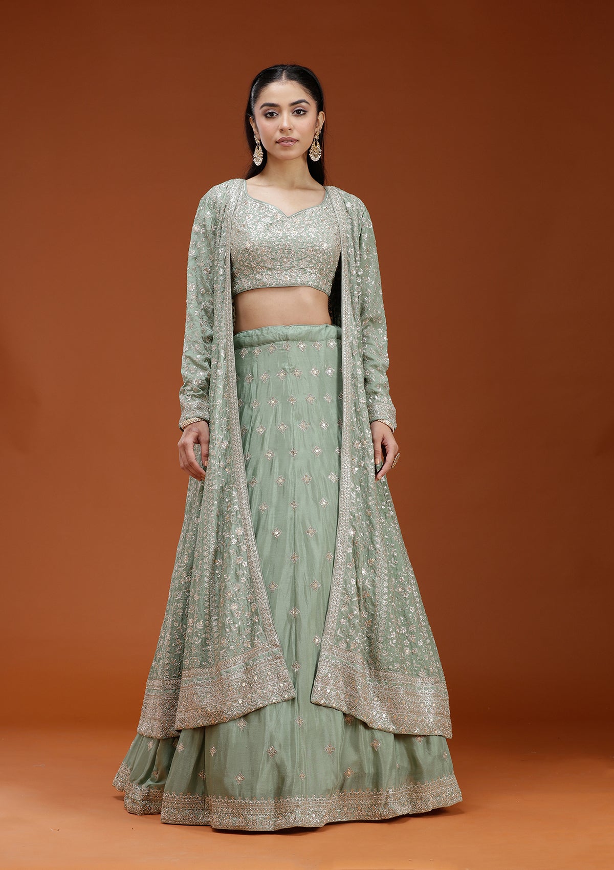 Pista Green Readymade Lehenga in Semi Crepe fabric The Lehenga is embellished with Zariwork (Gold) embroidery Accompanied with an Readymade blouse and dupatta Comes with the Koskii promise of premium quality.