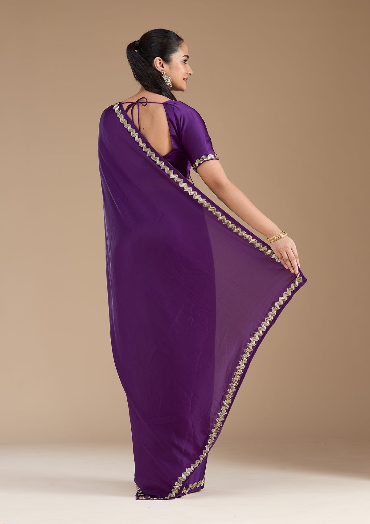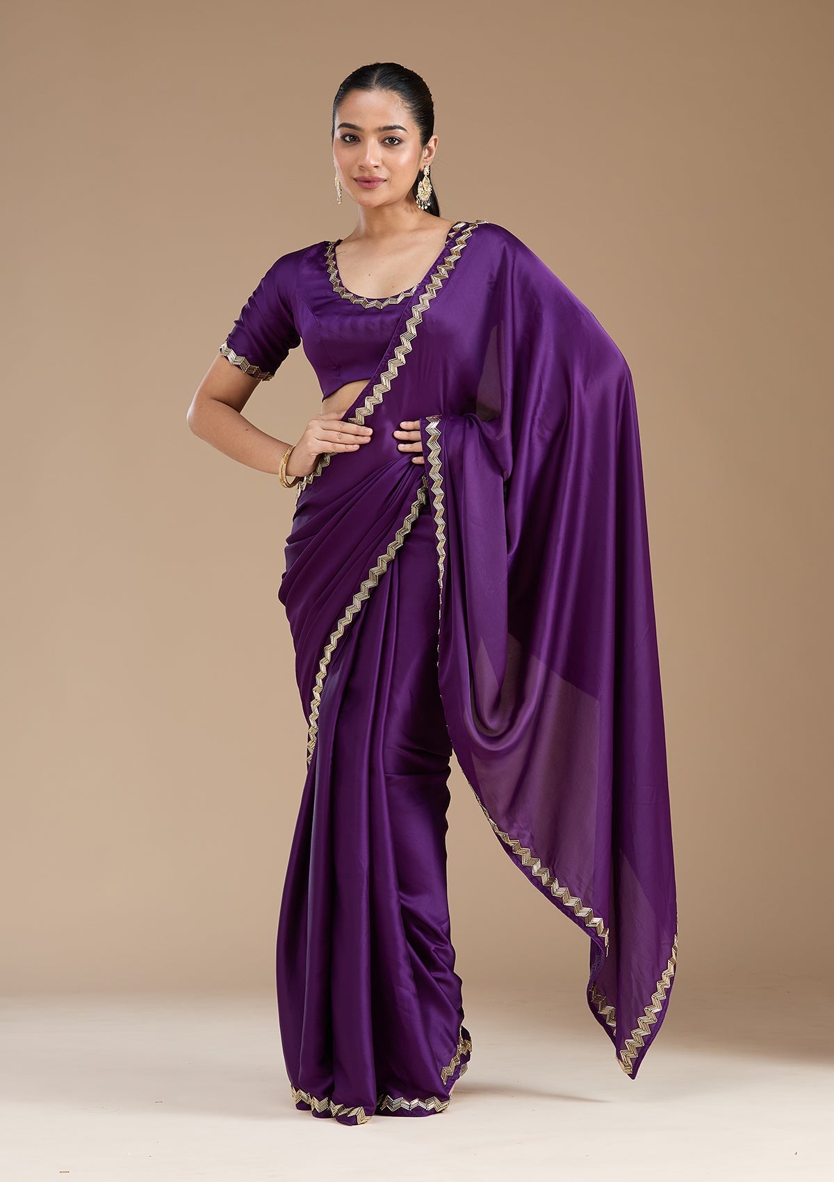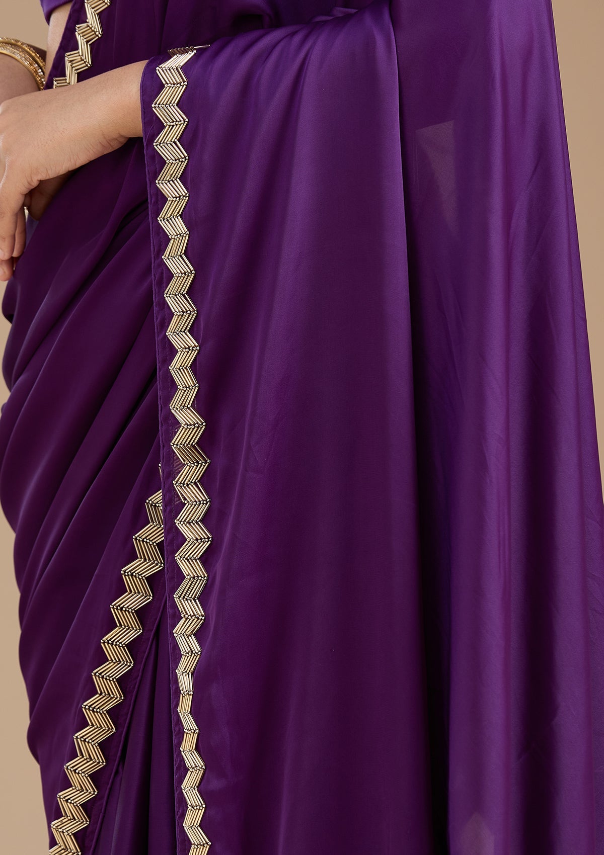 Purple Saree in Satin fabric. The Saree is elevated with Aariwork embroidery. It comes with an Unstitched blouse. Comes with the Koskii promise of premium quality.