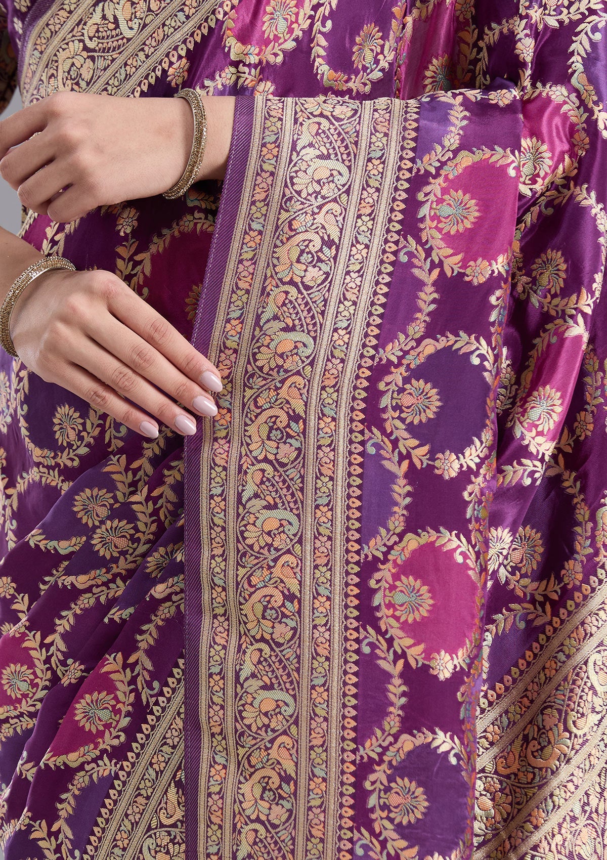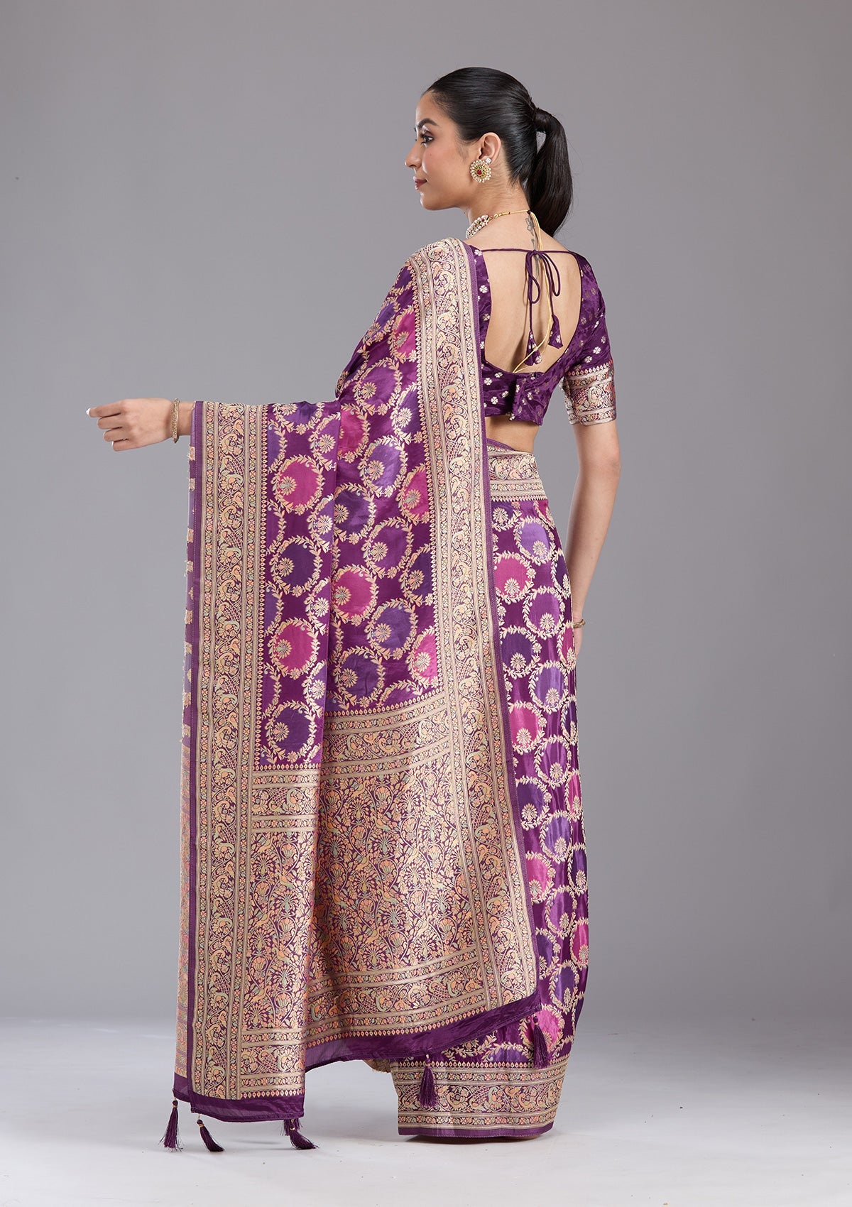 Purple Saree in Silk fabric The Silk_Saree is elevated with Banarasi embroidery It comes with an Unstitched blouse Comes with the Koskii promise of premium quality.