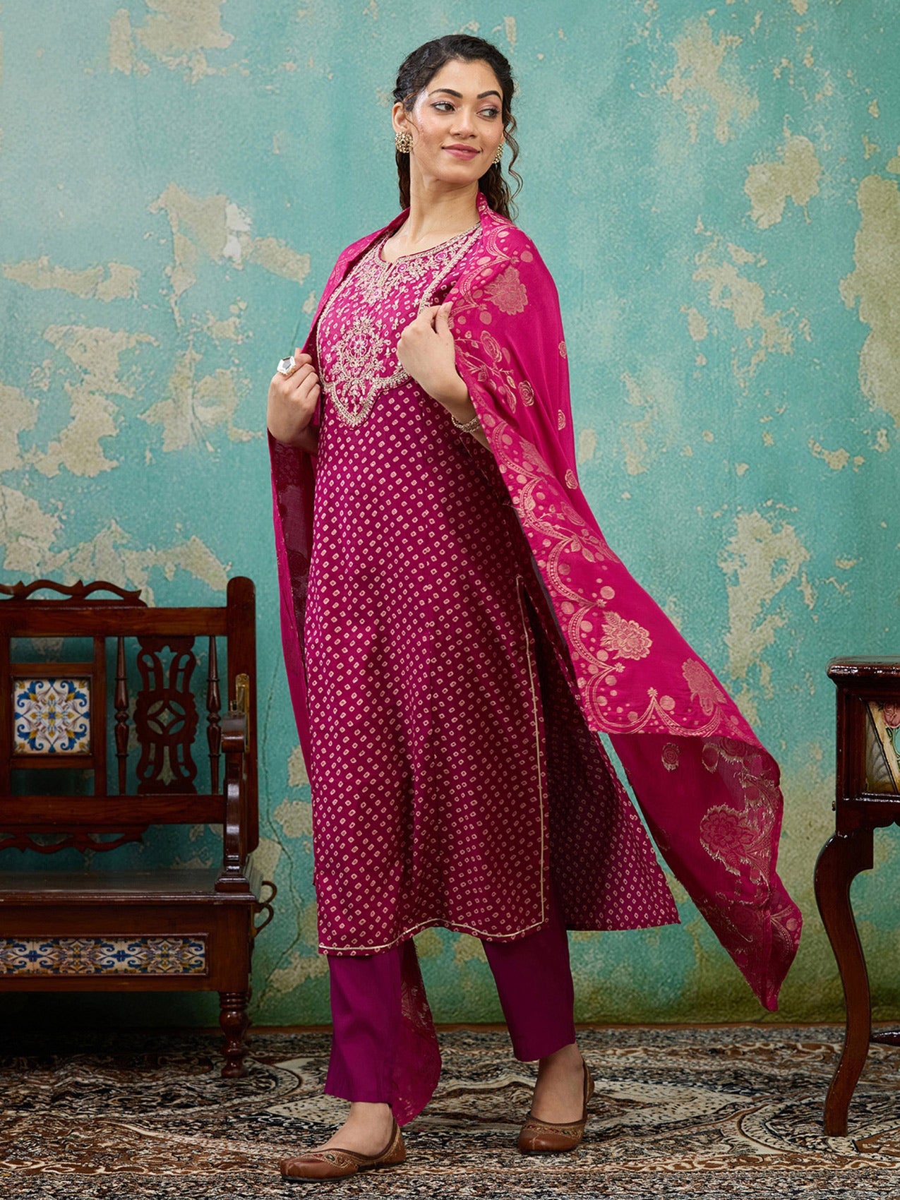Purple Salwar Suit in Chanderi fabric. The Salwar Suit is embellished with Cording embroidery. Accompanied with a bottom and dupatta. Comes with the Koskii promise of premium quality.
