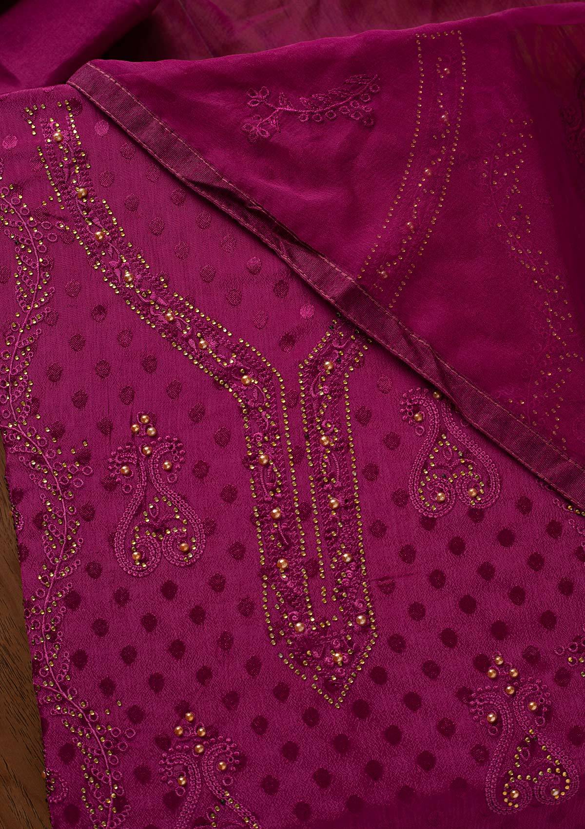 Purple Salwar Suit In Georgette Fabric. The Salwar Suit Is Embellished With Swarovski stone work. Accompanied with an unstitched bottom and dupatta. Comes With The Koskii Promise Of Premium Quality.