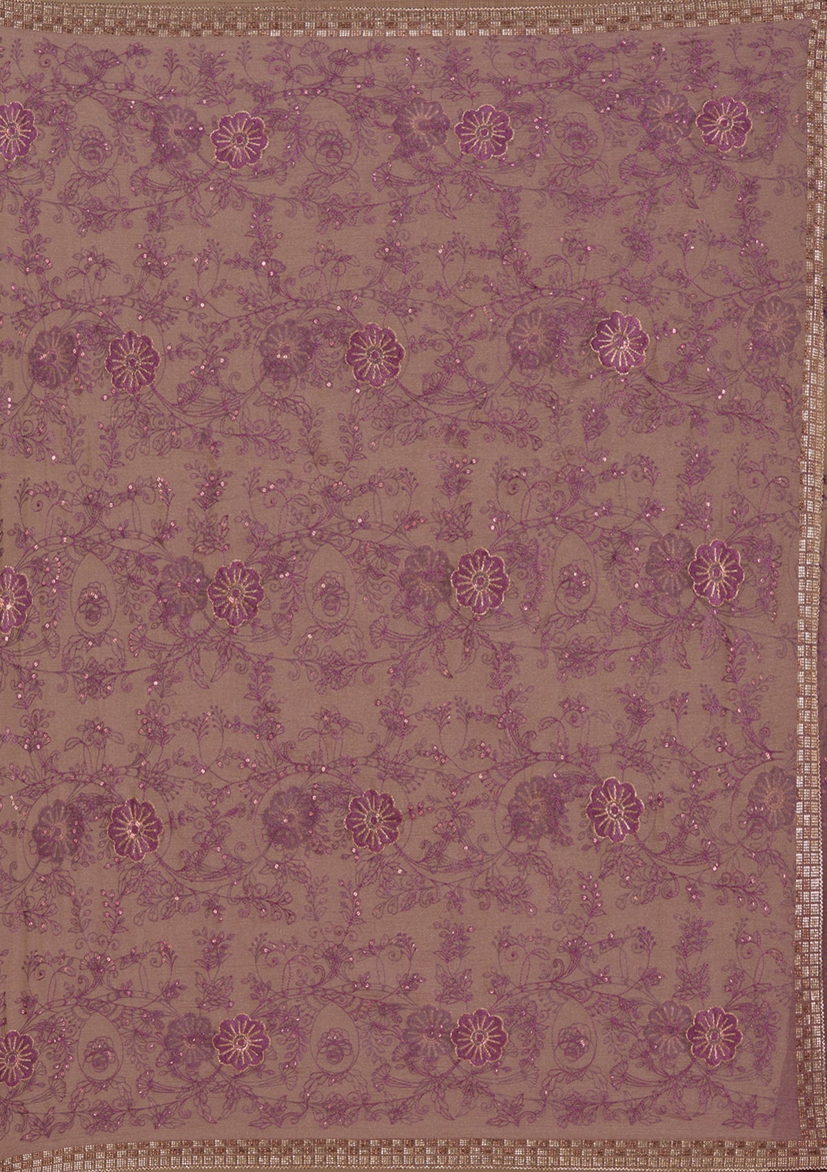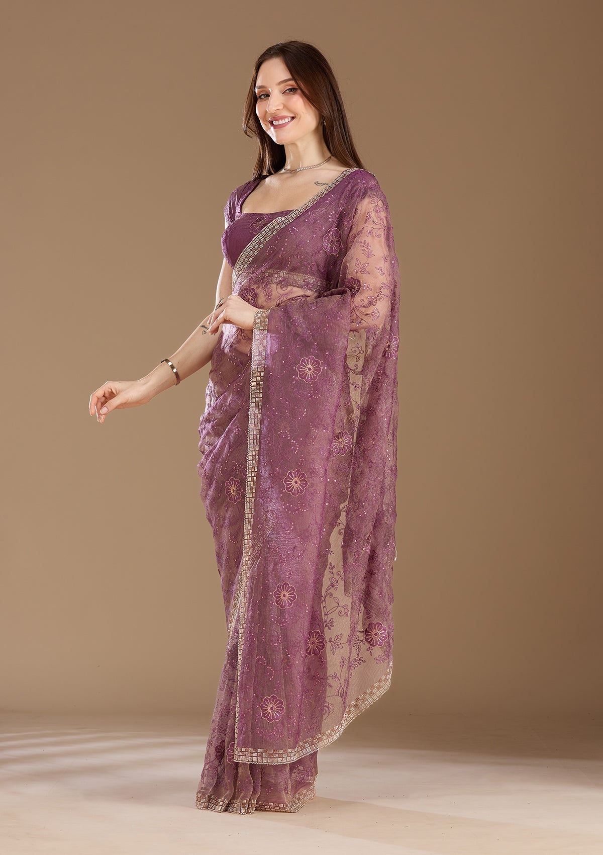 Purple Saree in Tissue fabric. The Saree is elevated with Threadwork embroidery. It comes with an Unstitched blouse. Comes with the Koskii promise of premium quality.