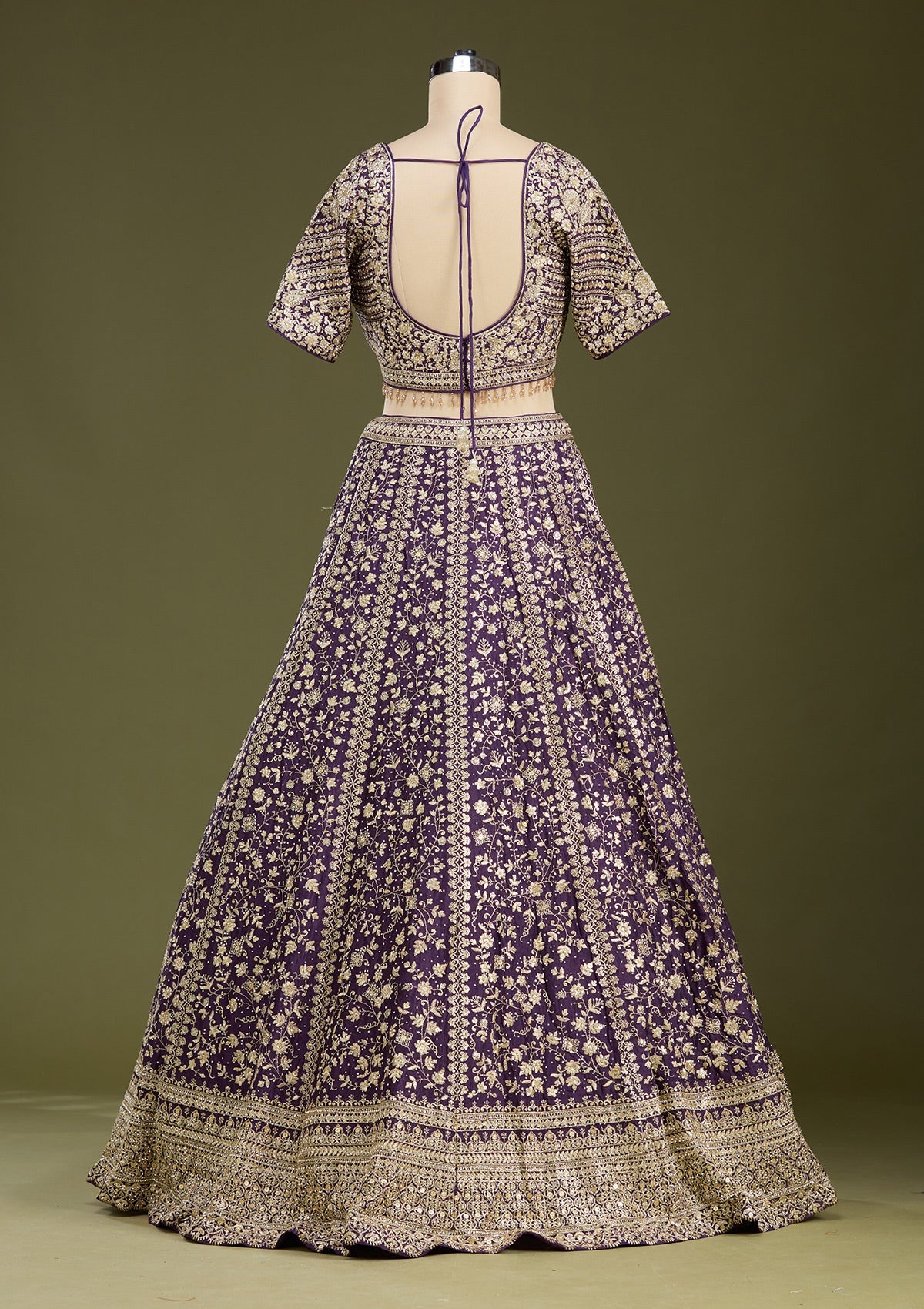 Purple Readymade Lehenga in Georgette fabric. The Lehenga is embellished with Zariwork (Gold) embroidery. Accompanied with an Readymade blouse and dupatta. Comes with the Koskii promise of premium quality.