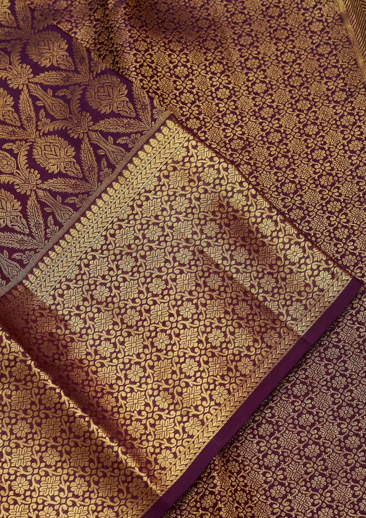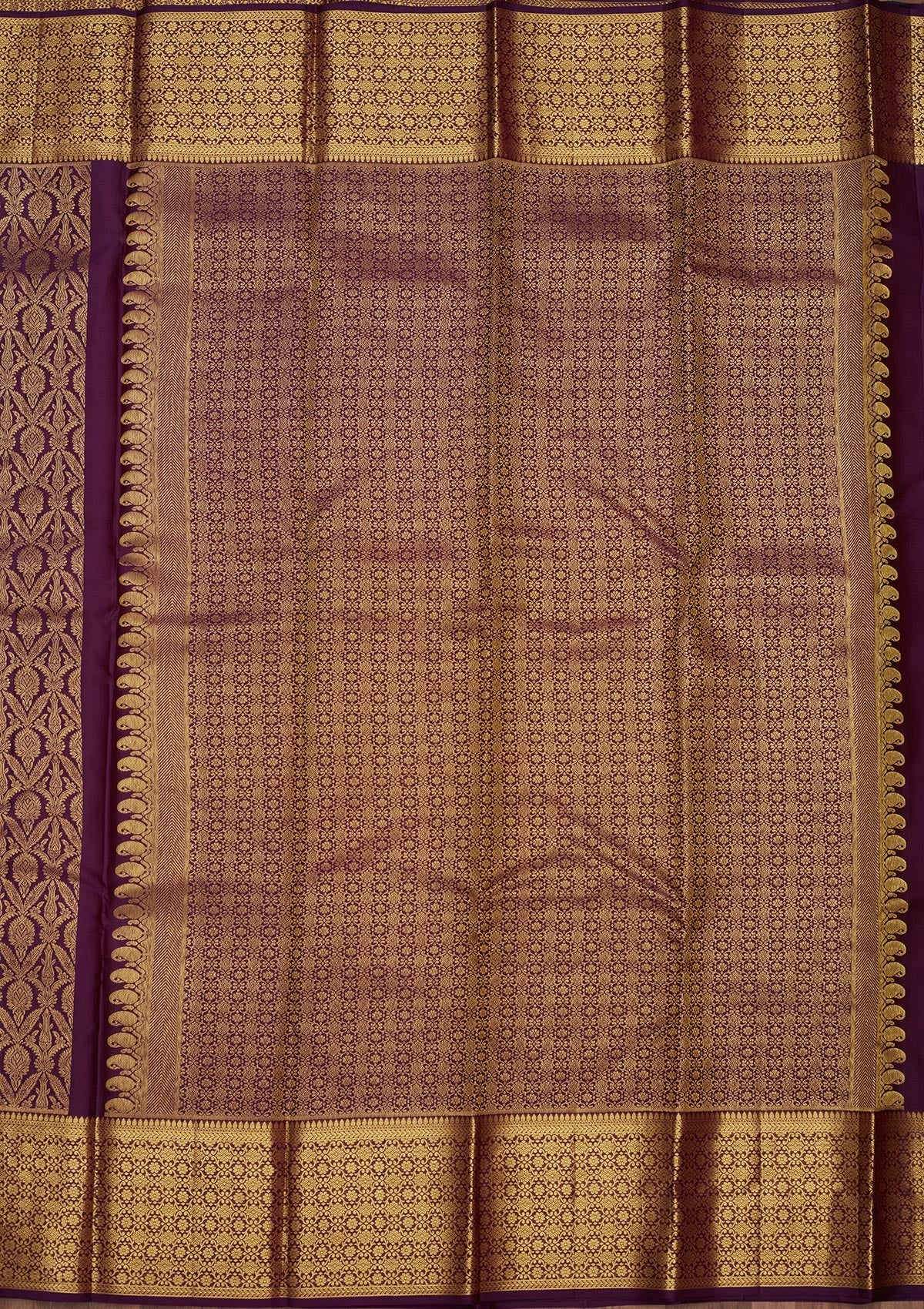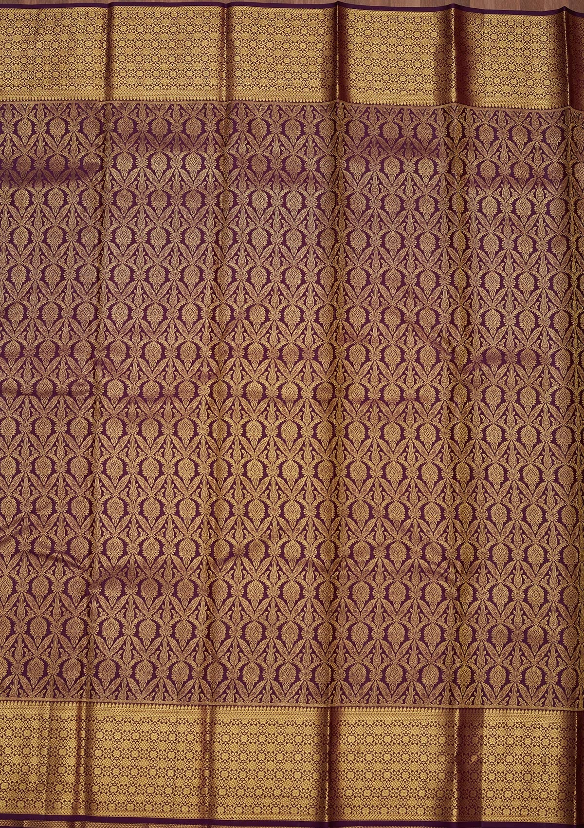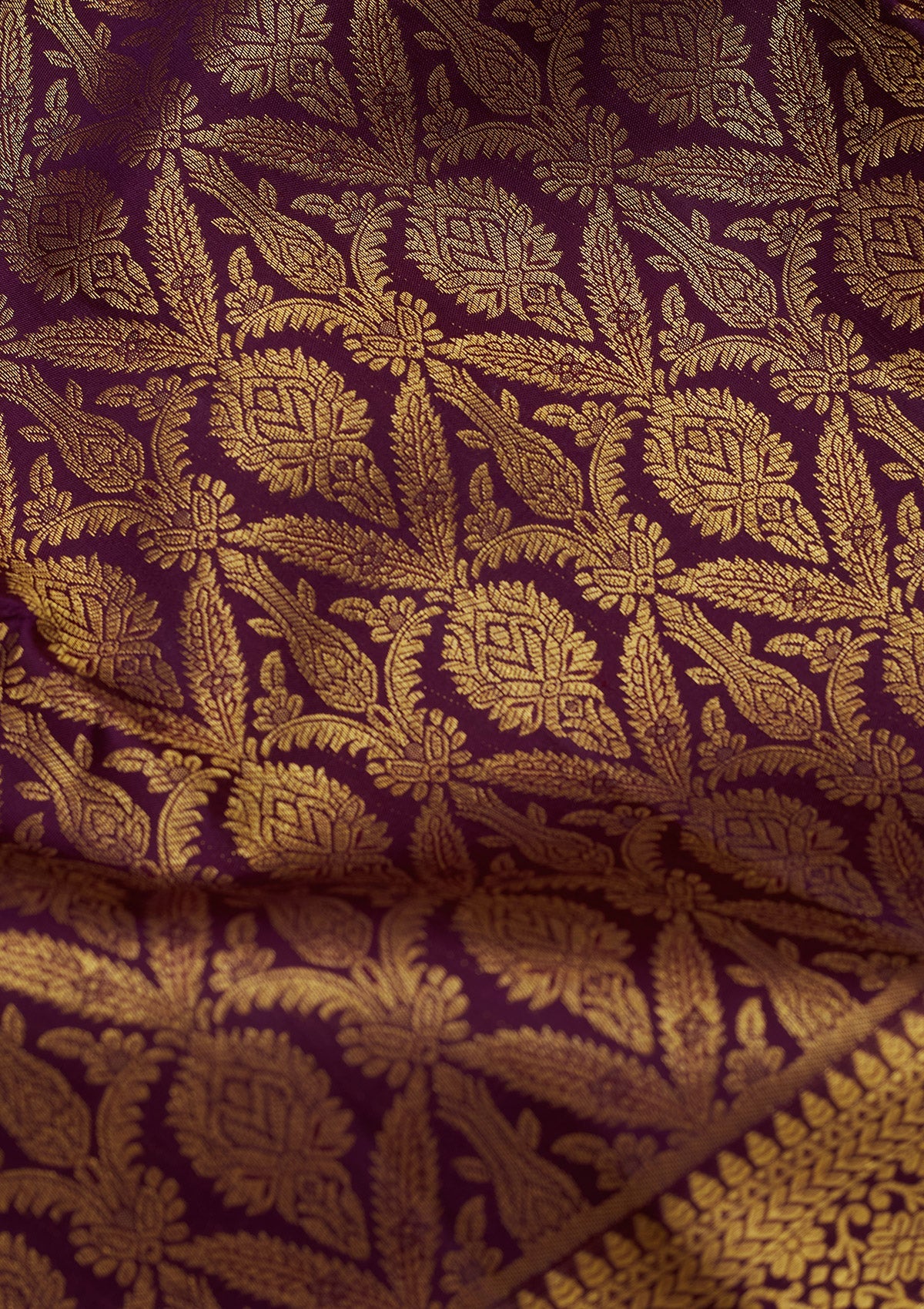 Purple Silk_Saree in Pure Silk fabric. The Silk_Saree is elevated with Zariwork (Gold) embroidery. It comes with an Unstitched blouse. Comes with the Koskii promise of premium quality.