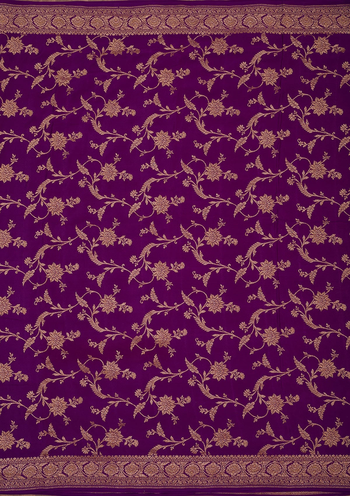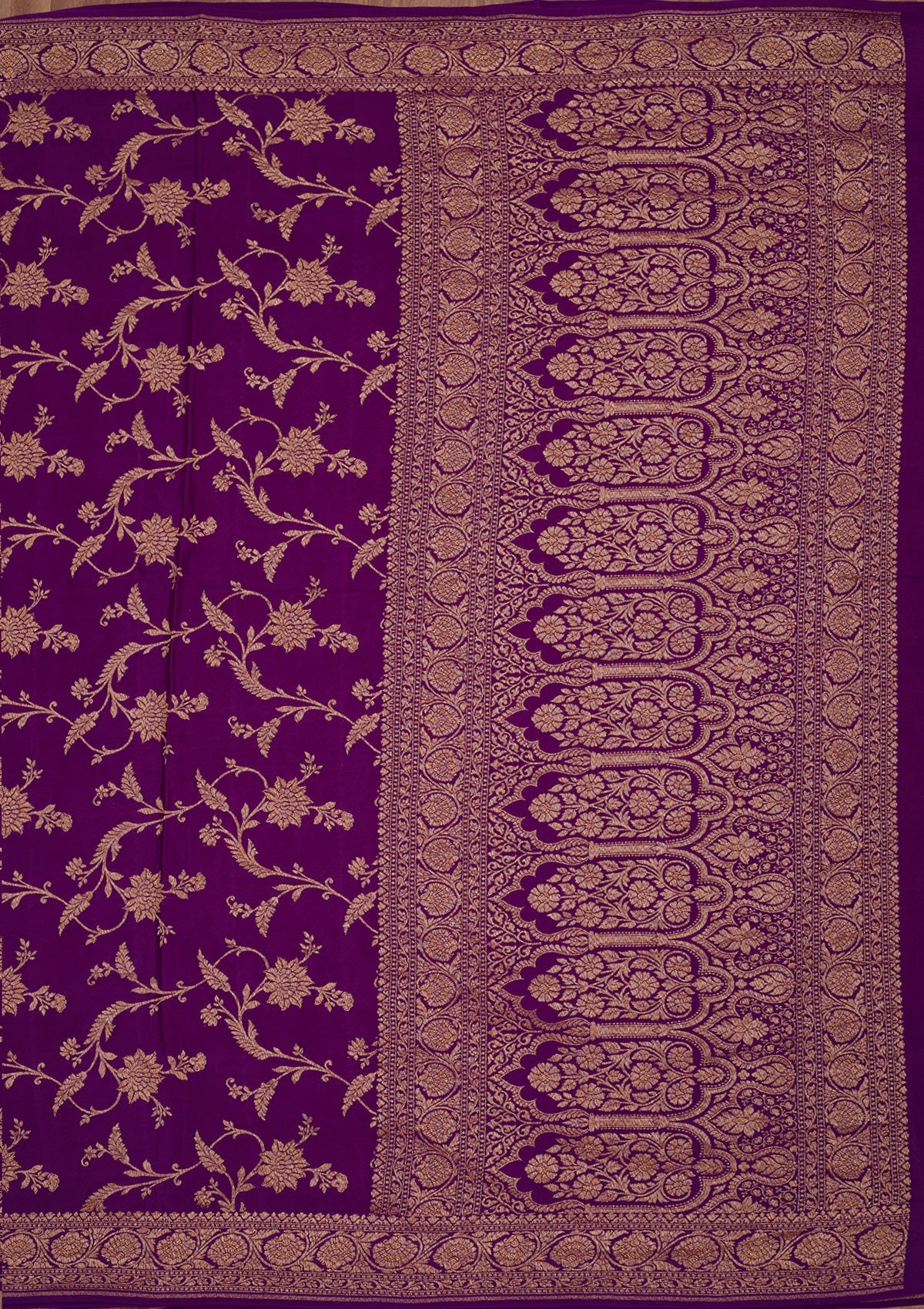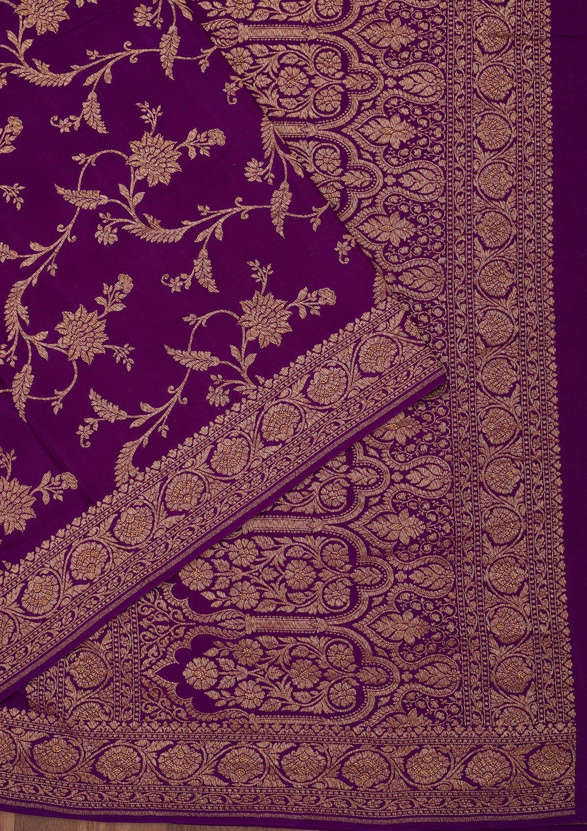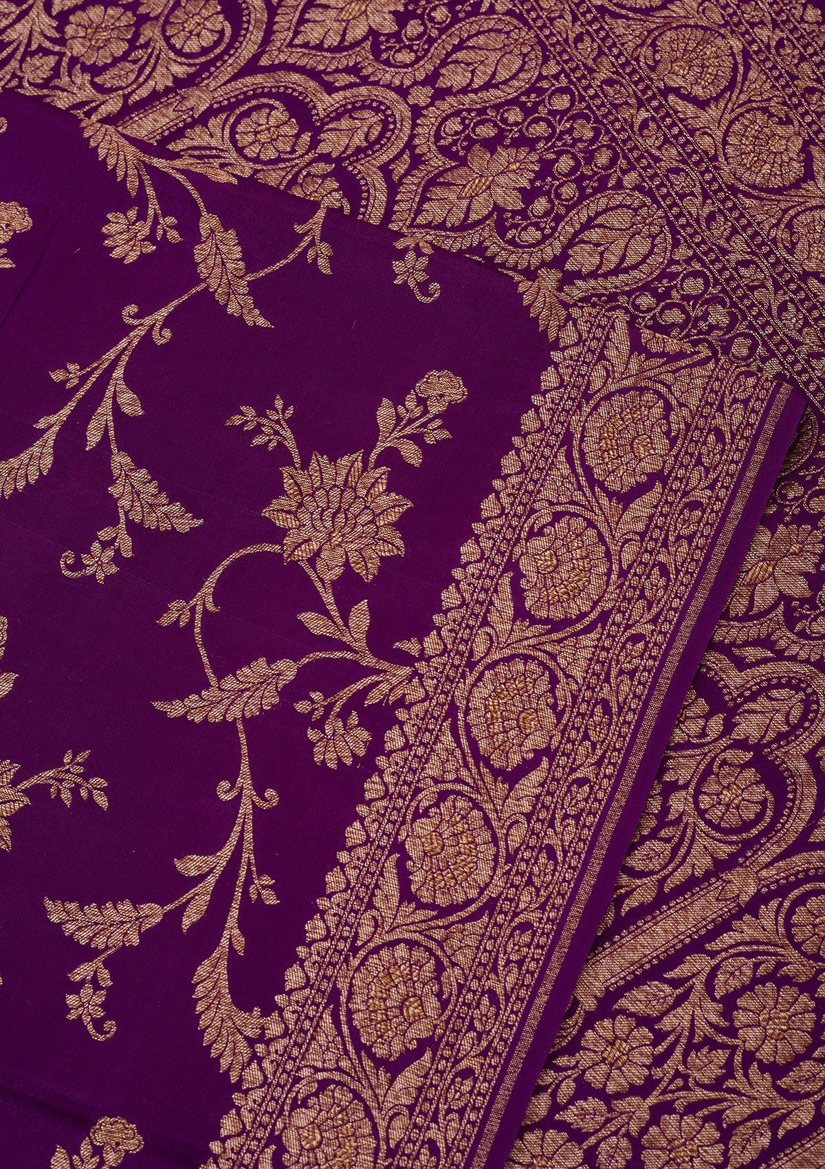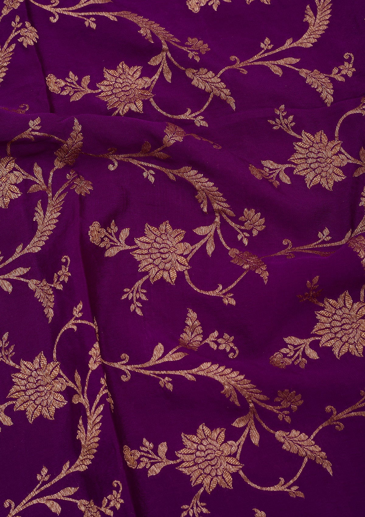 Purple Silk_Saree in Pure Crepe fabric. The Silk_Saree is elevated with Zariwork embroidery. It comes with an Unstitched blouse. Comes with the Koskii promise of premium quality.
