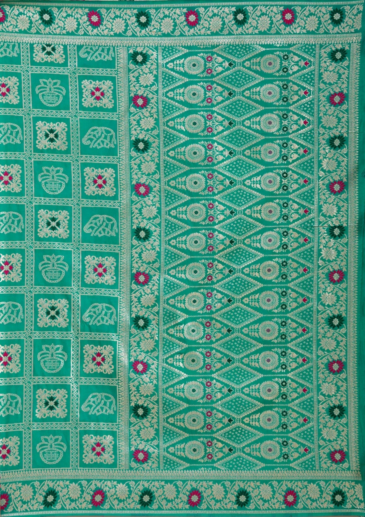 Rama Green Silk_Saree in Silk fabric. The Silk_Saree is elevated with Kanjivaram embroidery. It comes with an Unstitched blouse. Comes with the Koskii promise of premium quality.