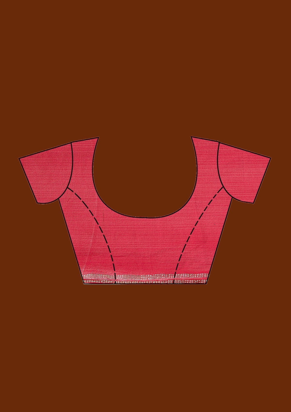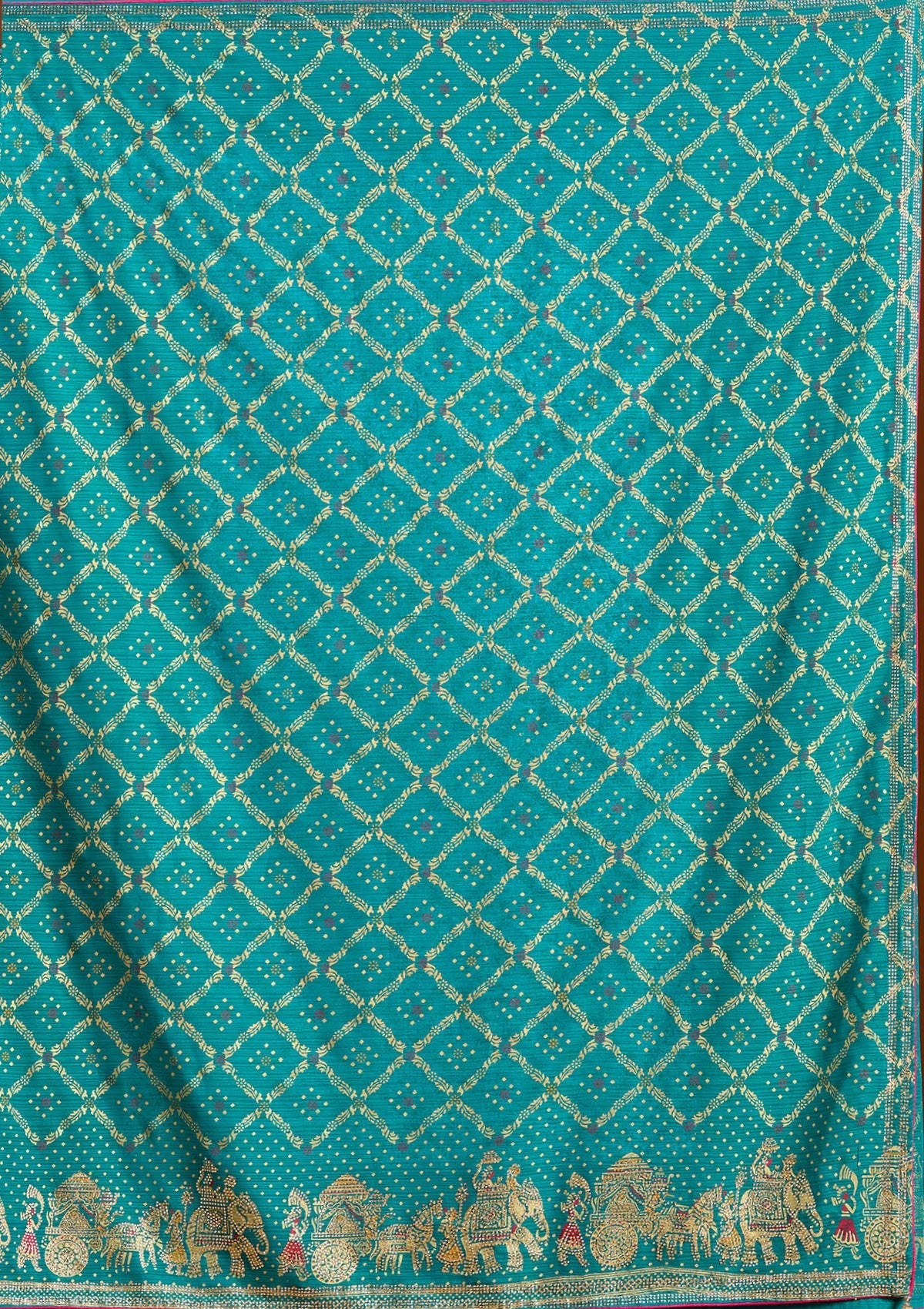 Rama Green Saree in Georgette fabric. The Saree is elevated with Stonework (Gold) embroidery. It comes with an Unstitched blouse. Comes with the Koskii promise of premium quality.