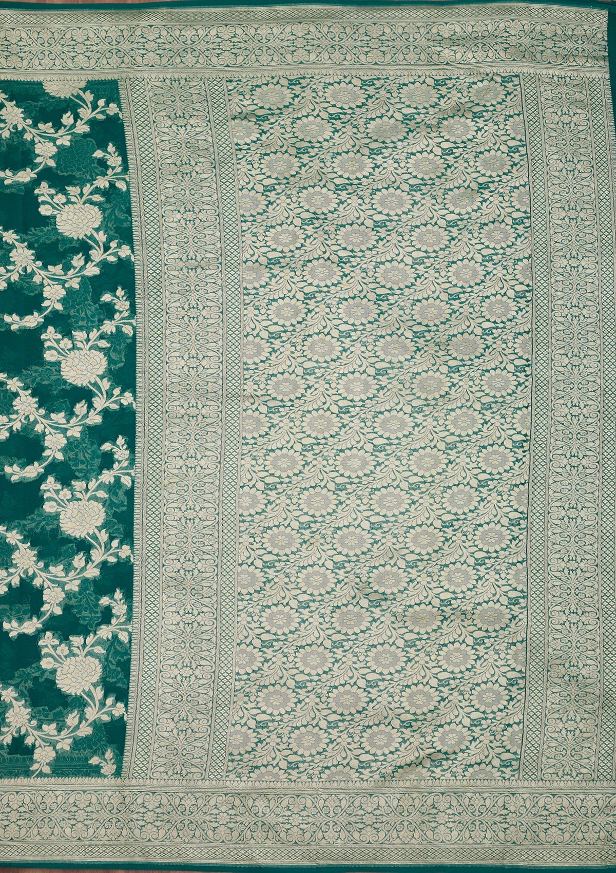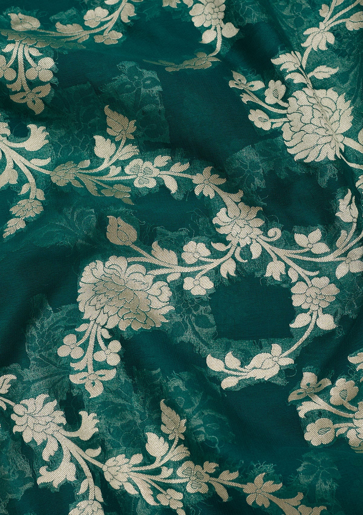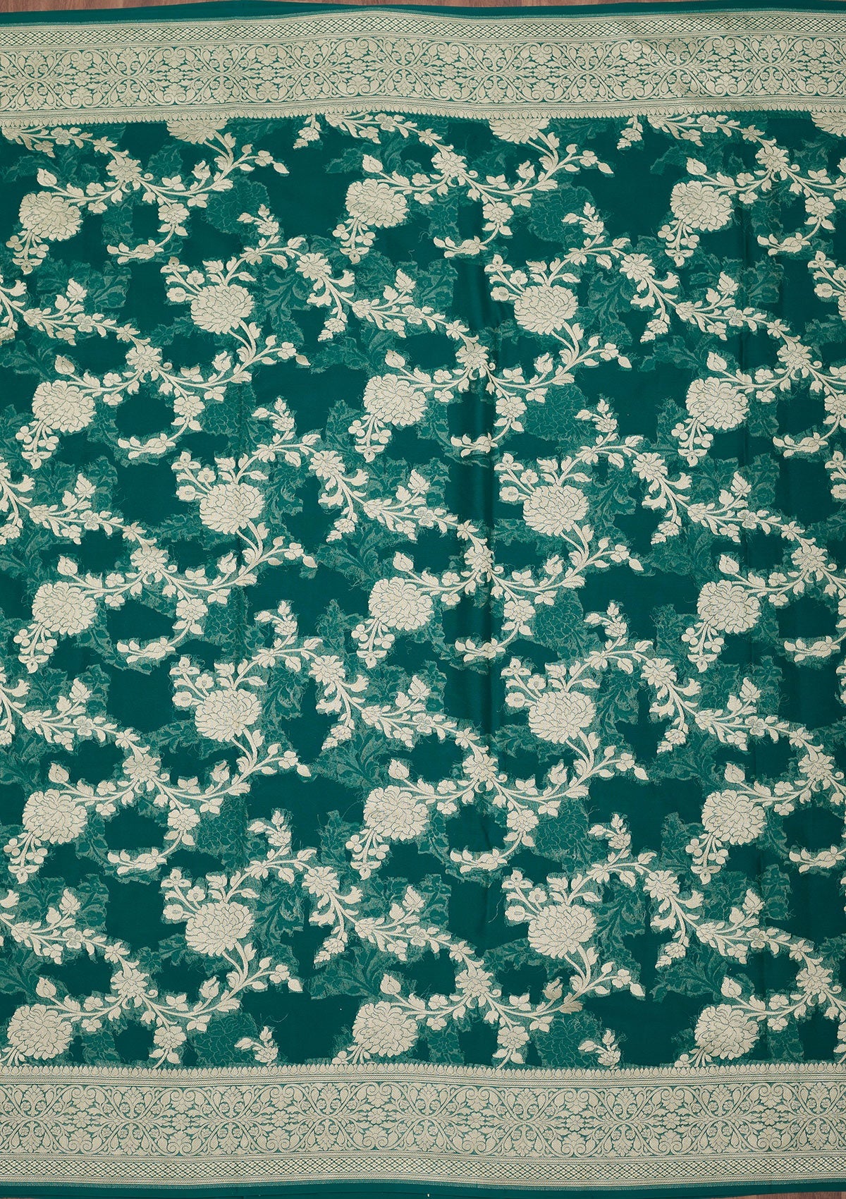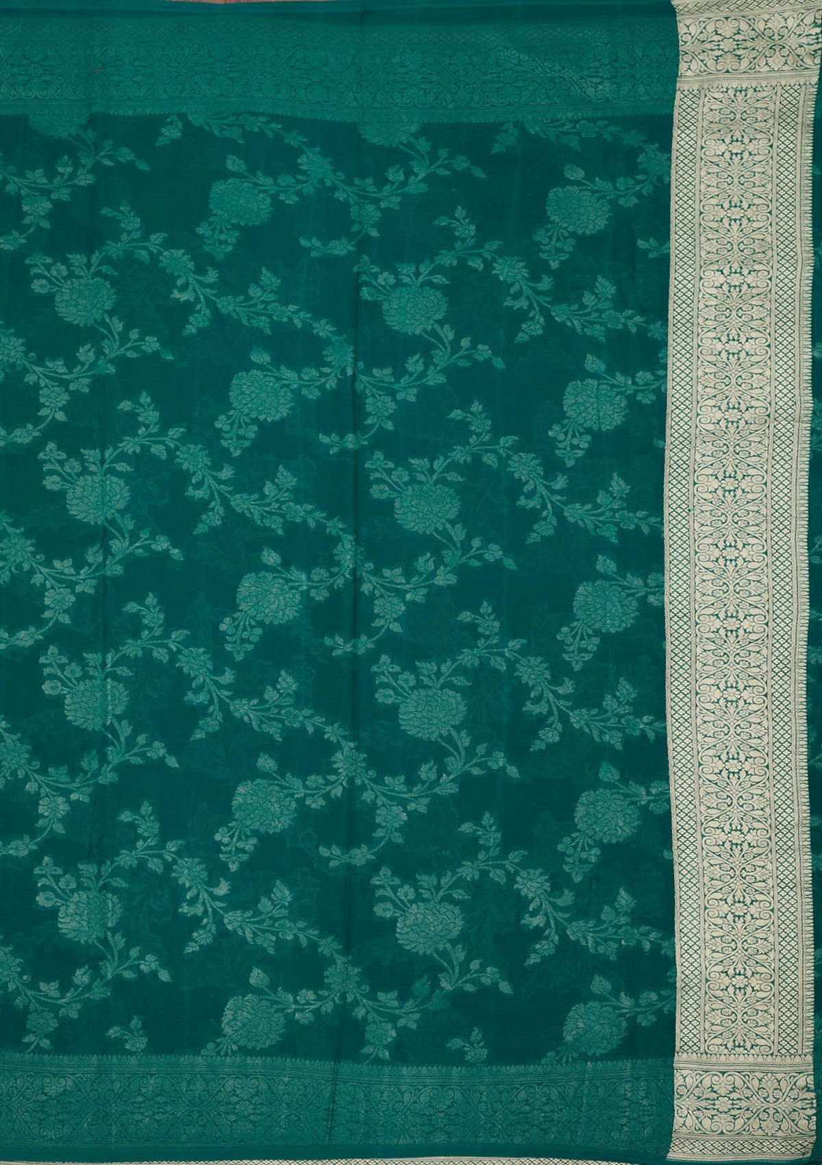 Rama Green Silk_Saree in Georgette fabric. The Silk_Saree is elevated with Zariwork embroidery. It comes with an Unstitched blouse. Comes with the Koskii promise of premium quality.
