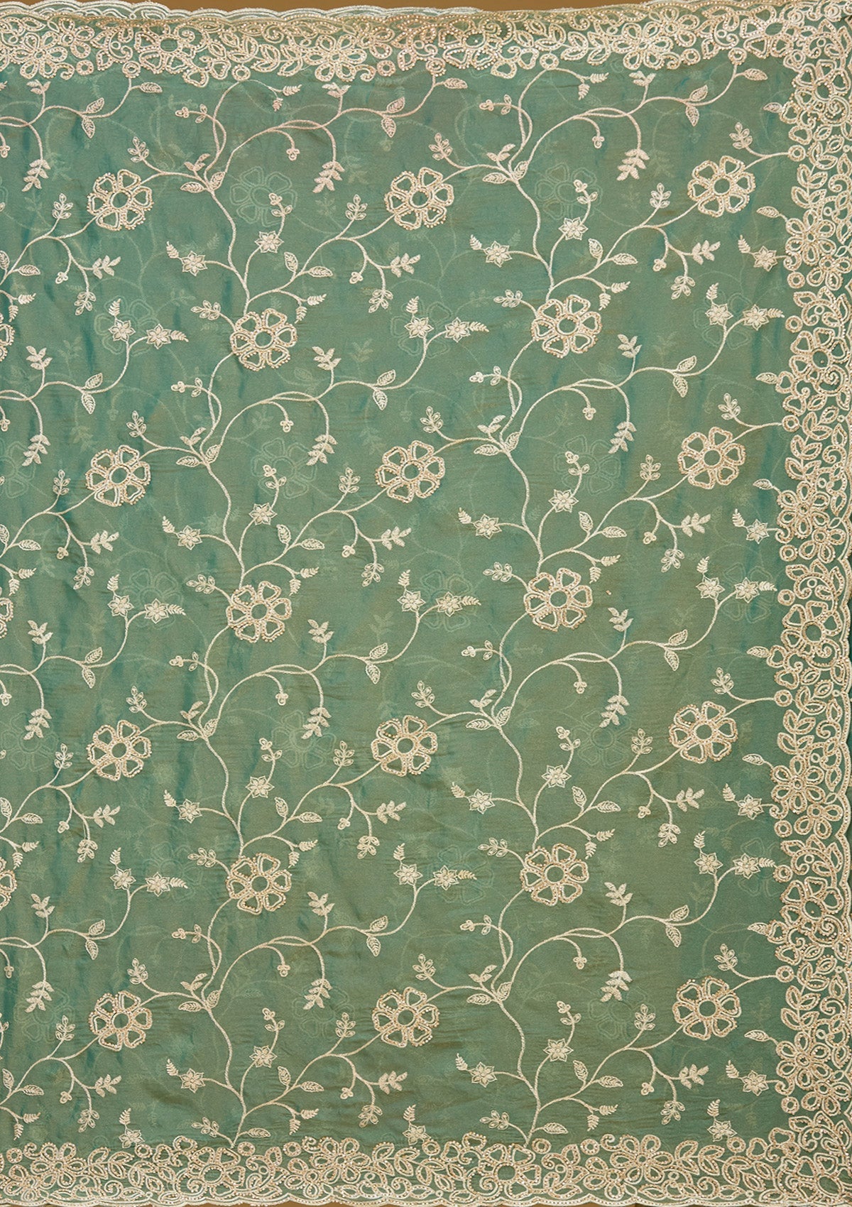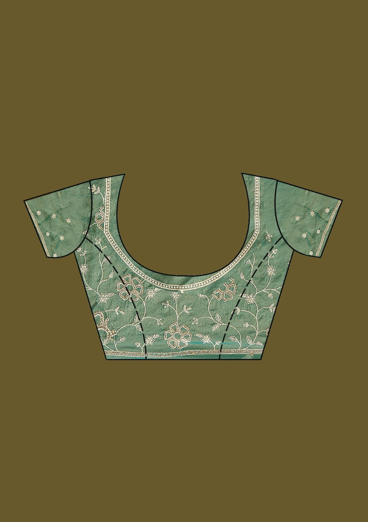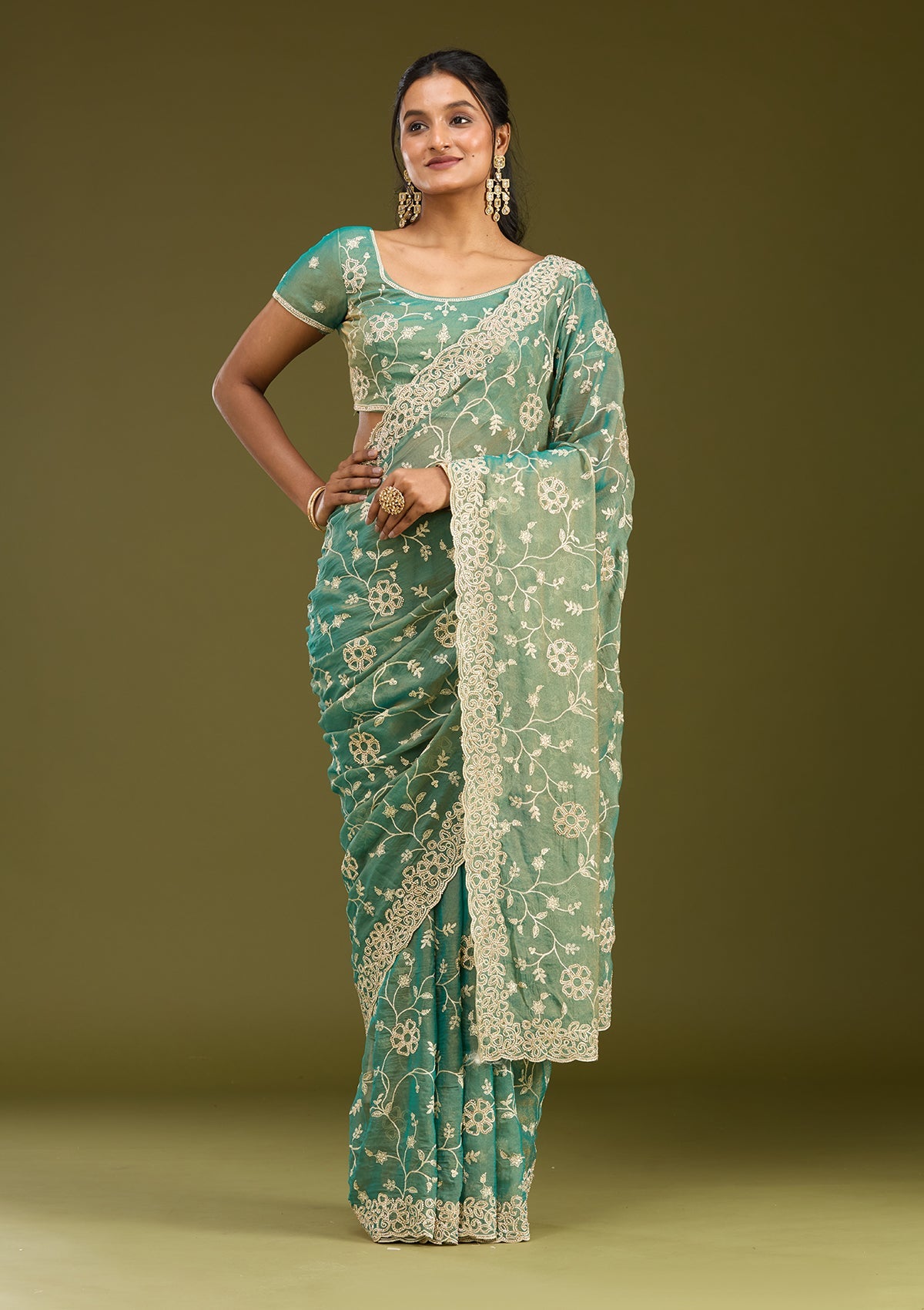 Rama Green Saree in Tissue fabric. The Saree is elevated with Zariwork (Silver) embroidery. It comes with an Unstitched blouse. Comes with the Koskii promise of premium quality.