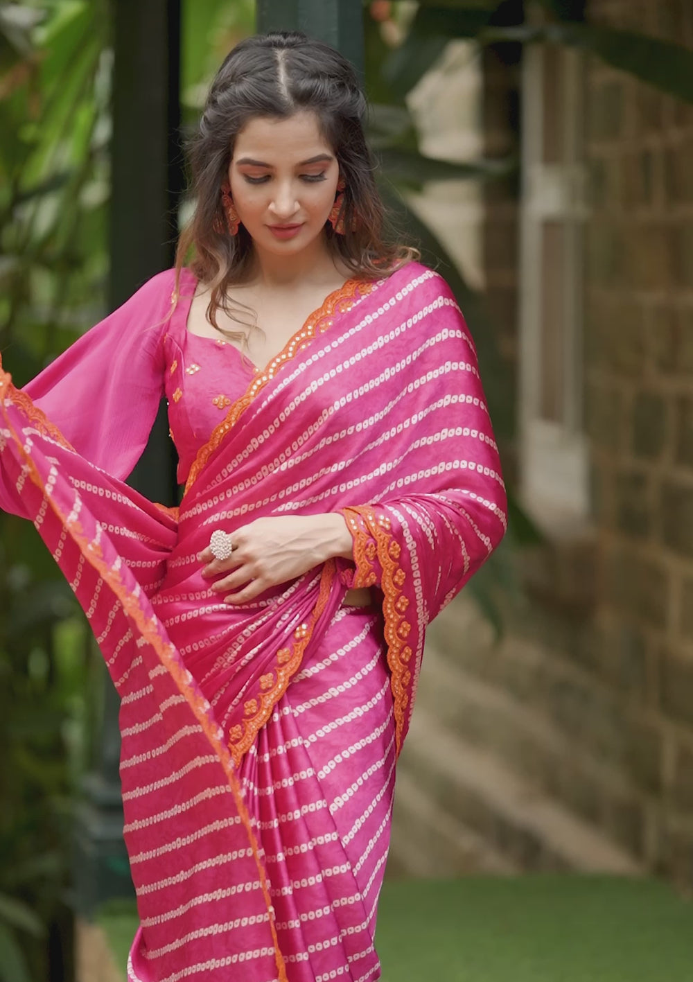 Turn heads and traditions upside down with this bandhani Saree. The rich fuchsia pink color, with contrasting orange embroidered detailing on the border, adds a touch of modernity to the classic bandhani print. . This saree is ideal for weddings, pheras, haldi, or mehendi events. You can also wear it for your Diwali parties or birthday celebrations. . It comes with a matching unstitched blouse piece with mirror work, but you can also pair it with a contrasting orange blouse for a different look.