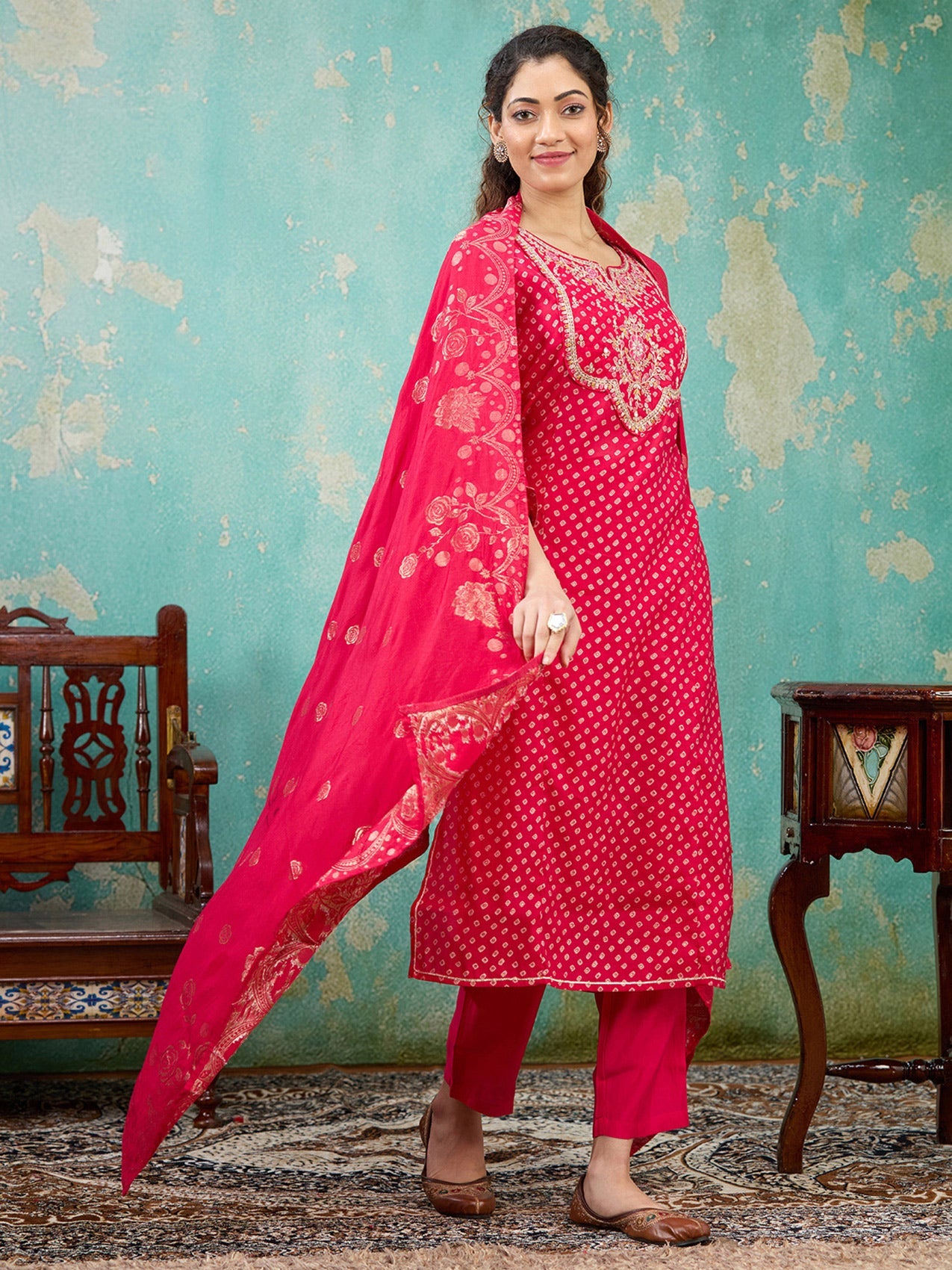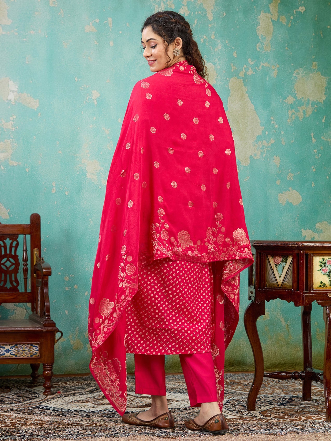 Rani Pink Salwar Suit in Chanderi fabric. The Salwar Suit is embellished with Cording embroidery. Accompanied with a bottom and dupatta. Comes with the Koskii promise of premium quality.