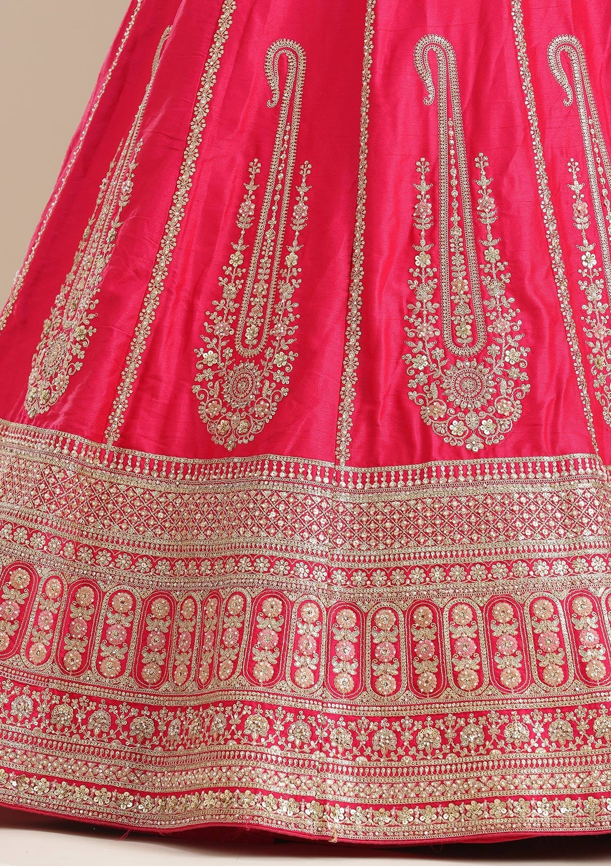 Rani Pink Semi-Stitched Lehenga in Raw Silk fabric. The Lehenga is embellished with Cording embroidery. Accompanied with an Semi-Stitched blouse and dupatta. Comes with the Koskii promise of premium quality.